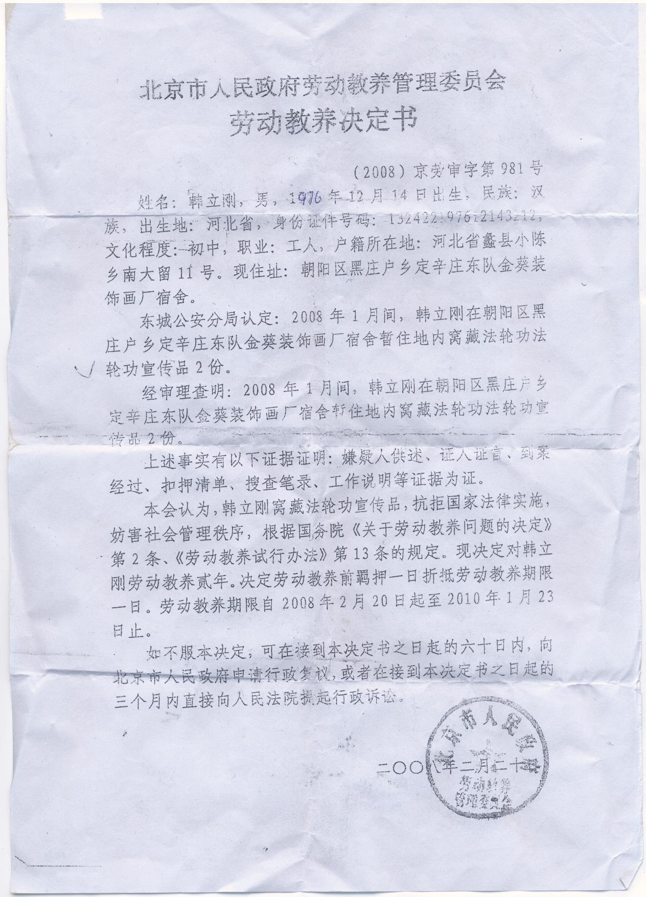 韩立刚,男,一九七六年出生,蠡县小陈乡南大留村人。二零零八年的一天,北京市公安局东城分局许多恶警把韩立刚上班的厂子包围起来,说要抓坏人,除看大门的以外,将老板及工人全部抓走。以搜出韩立刚的床铺下有两份真相传单为名,将他劫持到河南省郑州市白庙劳教所非法劳教二年。受到劳教所所长韩某、二队长郑某的残酷迫害。