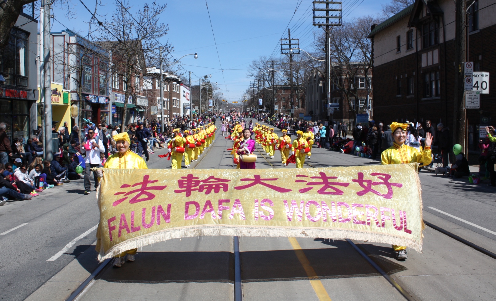 这次游行的总指挥Keith Begley介绍说:“今年是多伦多第四十八届复活节游行,将近五万观众。法轮功的天国乐团和腰鼓队是我们每年都邀请的。乐团的音乐优美,演奏出色。腰鼓队的表演给人很轻快的感觉,他们给人印象深刻,很受欢迎。我认为法轮功是这个游行里最好的一个团体。今天阳光灿烂,最适合复活节(庆祝)了。他们的到来给人们带来快乐。谢谢他们!”