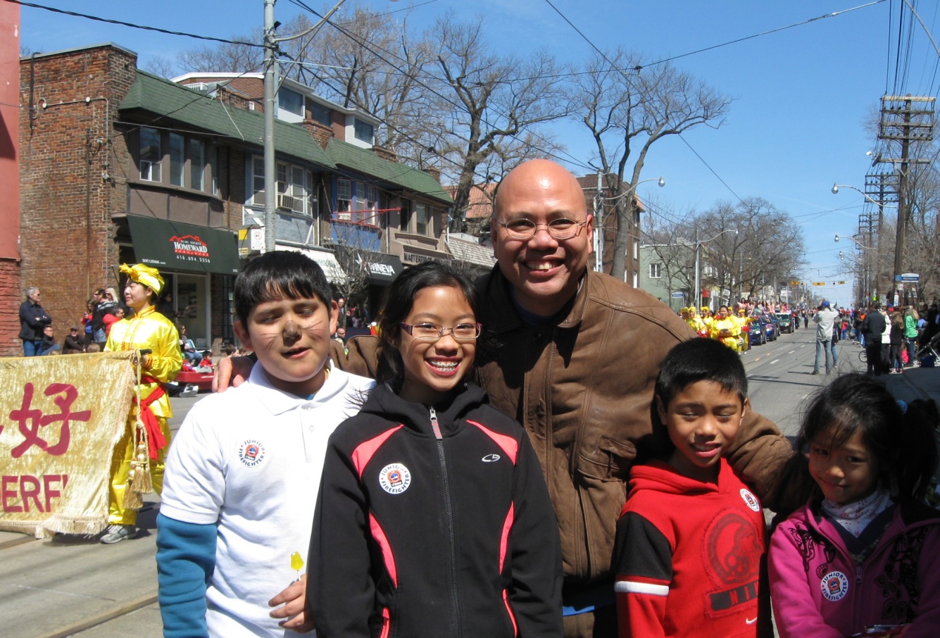 来自福建的林先生带着孩子在观看游行,他说:“虽然来多伦多七年了,还是第一次看到法轮功的游行队伍这么壮大,非常受欢迎。很有自豪感。孩子也非常高兴,我会多上网去了解。”