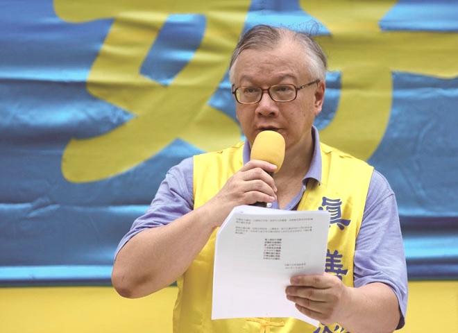 ![]() 图2. 香港法轮佛学会发言人简鸿章在集会上表示:只有解体中共,才能停止迫害,国人及世人才能走向美好的未来。 |