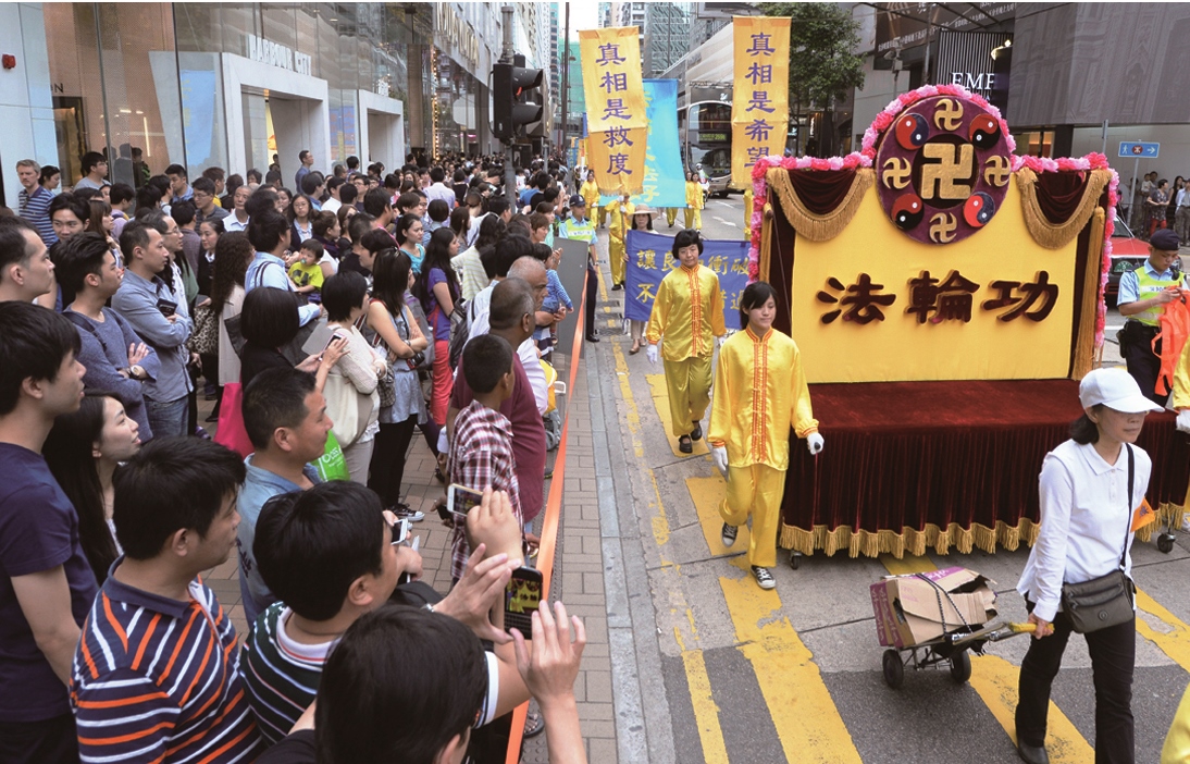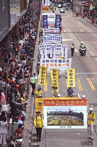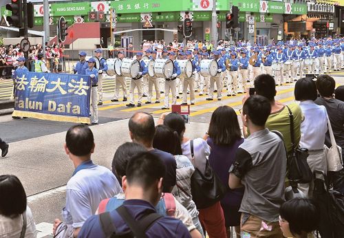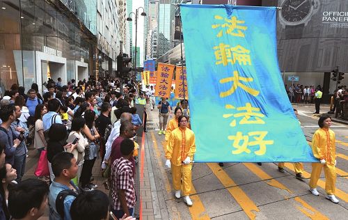 壮观的遊行队伍吸引了不少大陆遊客驻足观看,纷纷用手机、相机拍摄画面。大陆遊客在香港旅行购物之余,看到在大陆看不到的画面,不少人说,感到非常震撼,他们对于警察紧随遊行队伍旁边规划,为遊行路线开道感到惊讶。不少人因此了解法轮功真相,当场请沿路派发资料、讲真相的学员义工协助办了三:退.(退出共产党、团、队)。