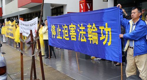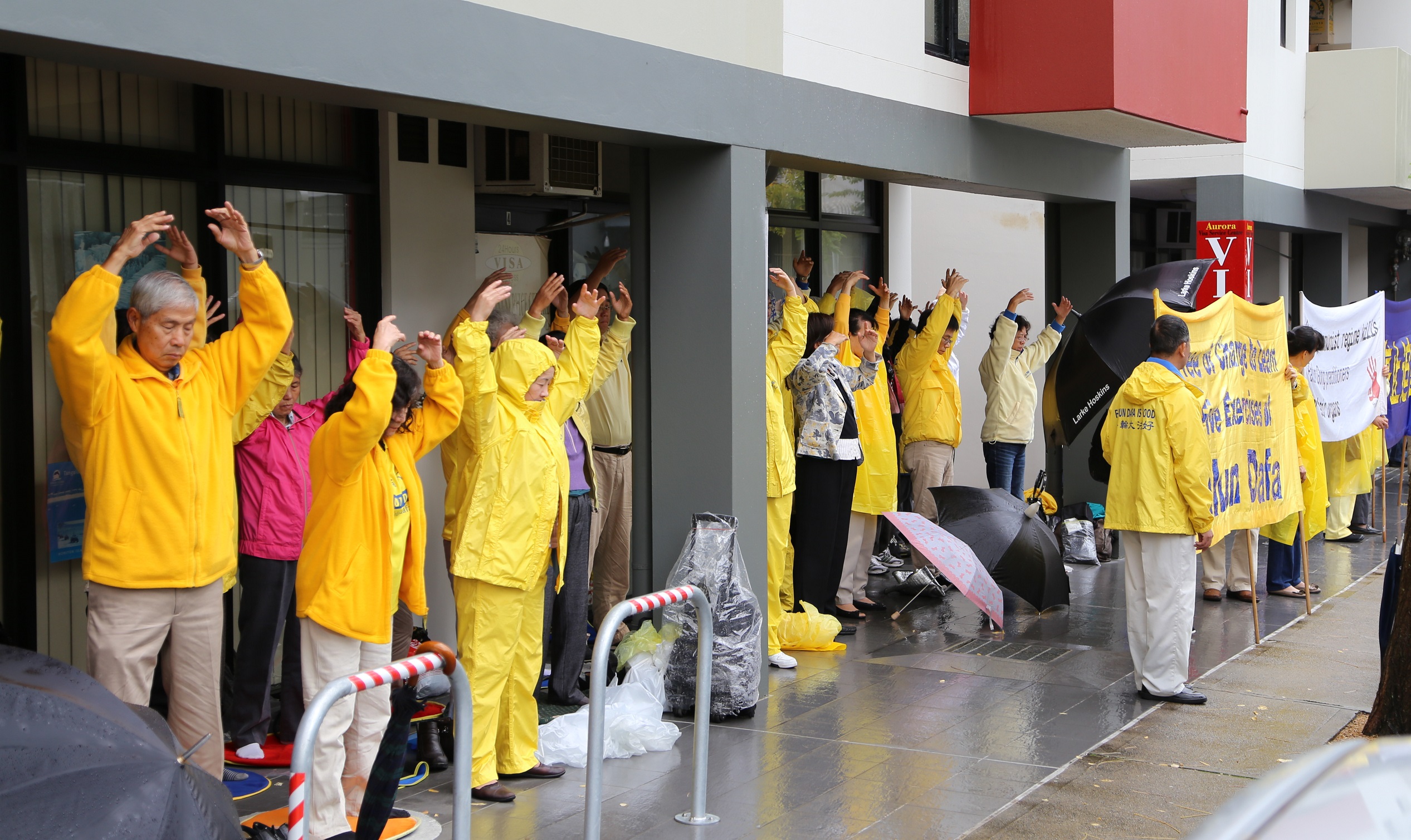 ![]() 悉尼学员在中领馆前炼功,呼吁制止迫害。 |