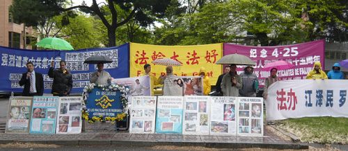 集会开始不久,天空下起密集的雨滴。而写有“法轮大法好”的金黄色大横幅在蒙蒙细雨中更加夺目。过路的民众看到静静地伫立在雨中的法轮功学员和平反迫害的情景,纷纷停住匆忙的脚步,前来了解真相。许多人看到真相展板和真相传单上的内容对现在发生在中国大陆的迫害感到十分震惊。