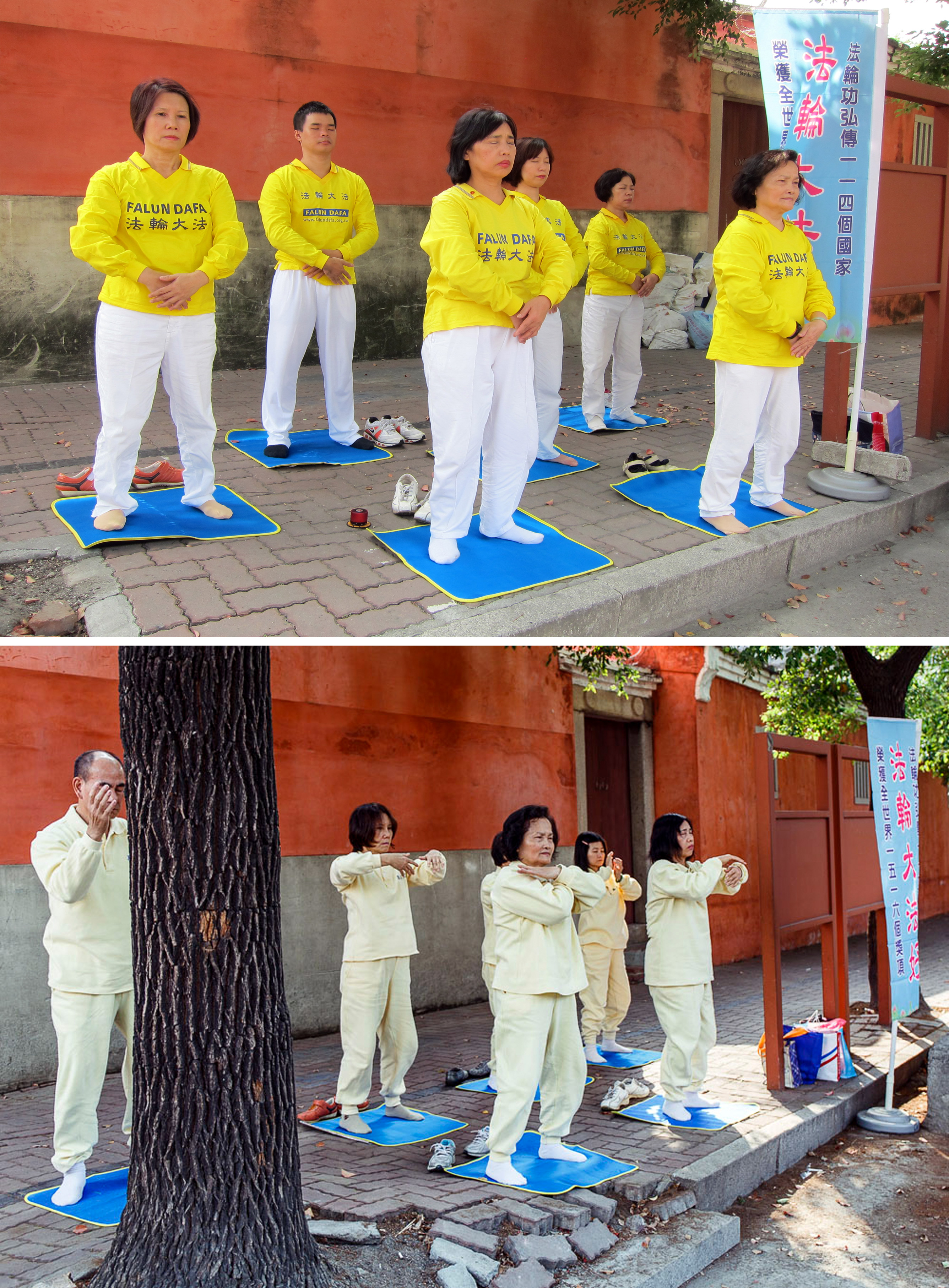 赤崁楼对面是武庙,在假日的上午和下午,都有法轮功学员炼功的场景,红墙衬托出法轮大法学员黄色上衣,相当引人注目。高医医学系的杨同学在其中显得很突出,他单纯地说:“希望让更多人认识法轮大法的美好。”