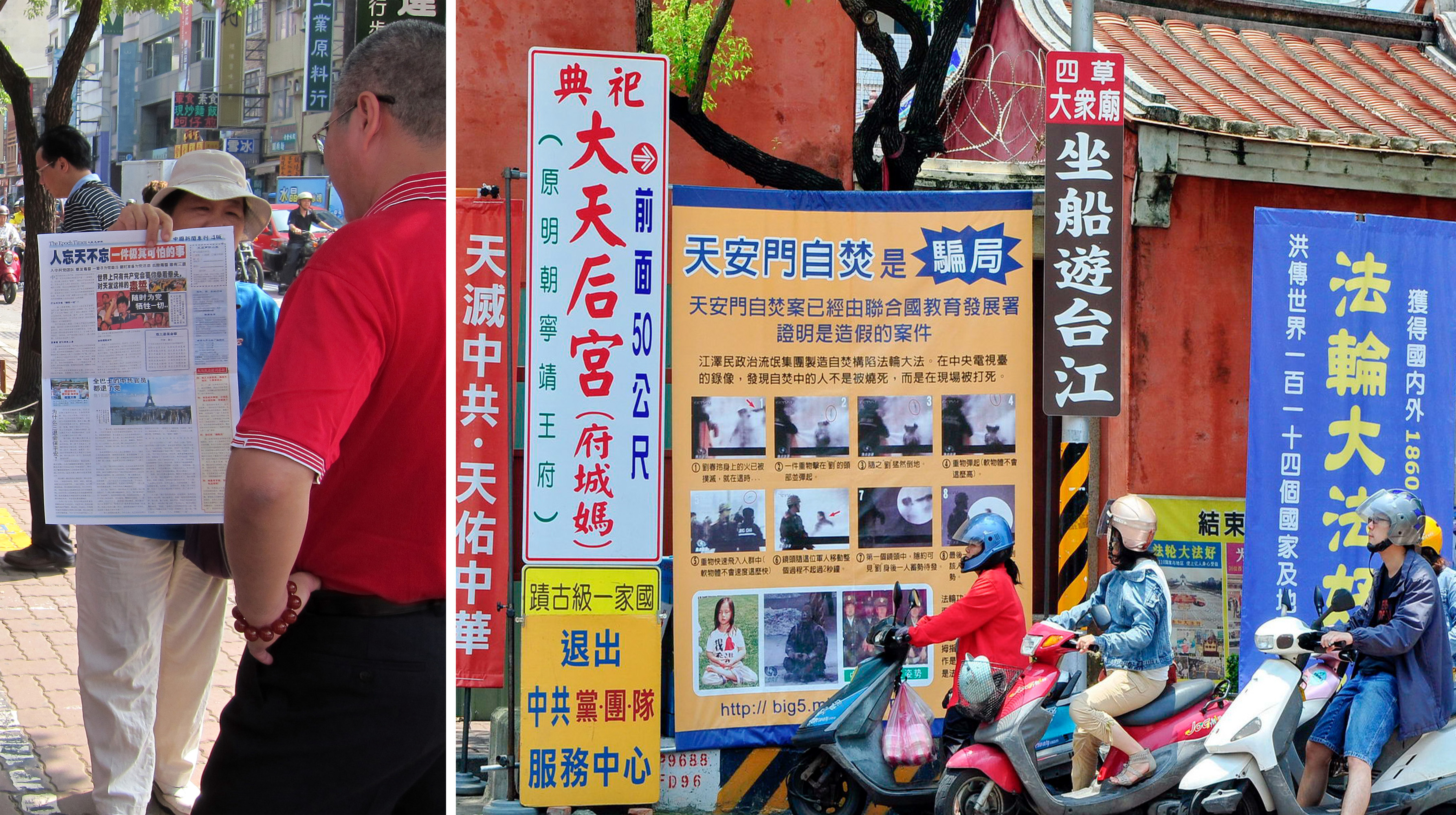 ![]() 在赤崁楼一大片赭红色的墙壁前,展示一排真相看板,近十一年来法轮大法学员风雨无阻、全年无休的来此讲真相。 |