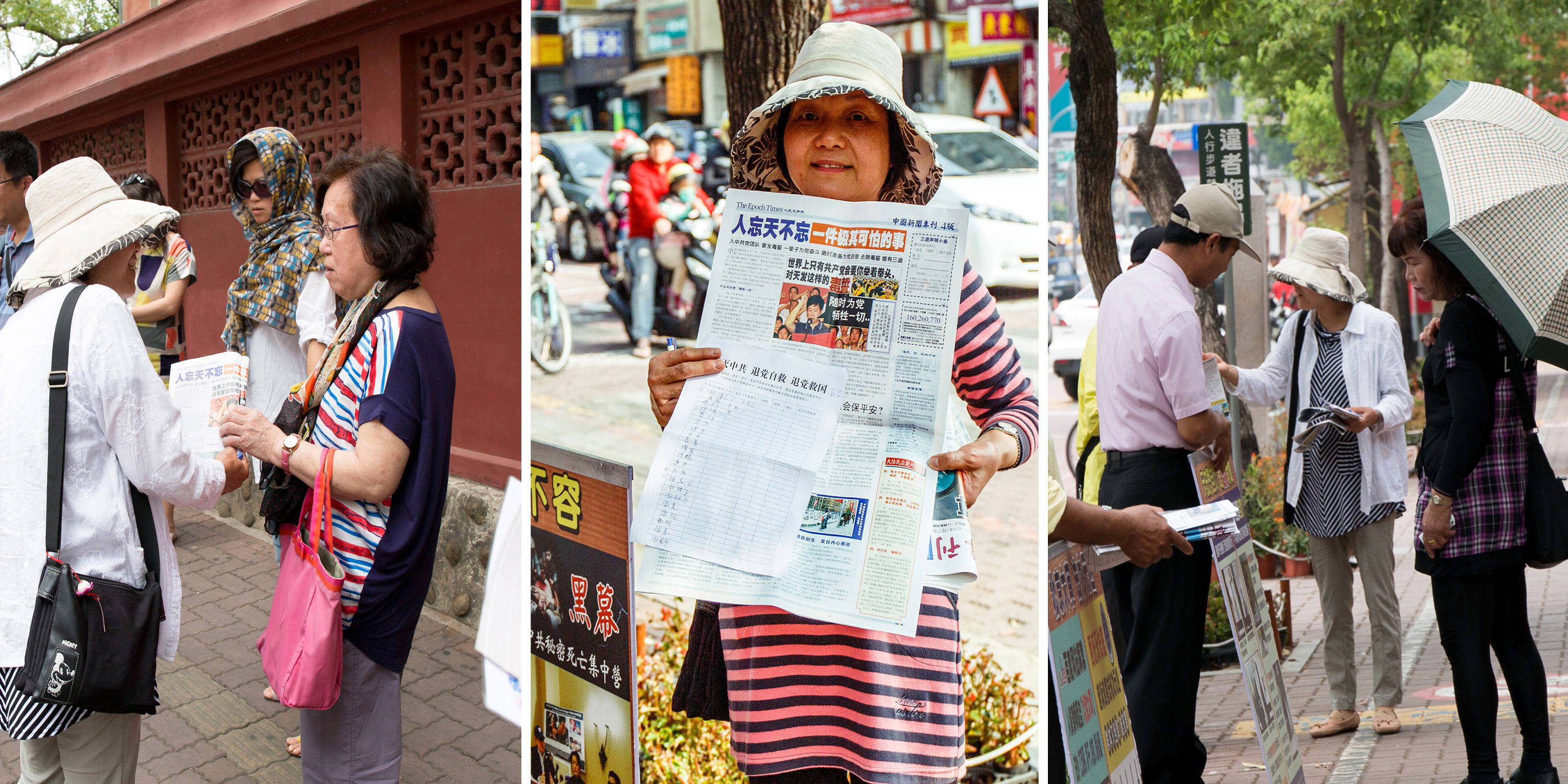 在这里法轮功学员是风雨无阻摆展板,郑大姐印象最深刻的是有“一次台风天,赤崁楼放假关门,但是大陆游客的行程排定了就不易更改,她说:“我就充当义务解说员,带着领队、导游和团员介绍赤崁楼周围古迹特色,顺便把大法真相融入进去,他们听得很专心,最后很感谢我,几乎全团都做了三:退.,包括领队也退了党。现在很多领队也都退了党团队,一点都没有犹豫。”