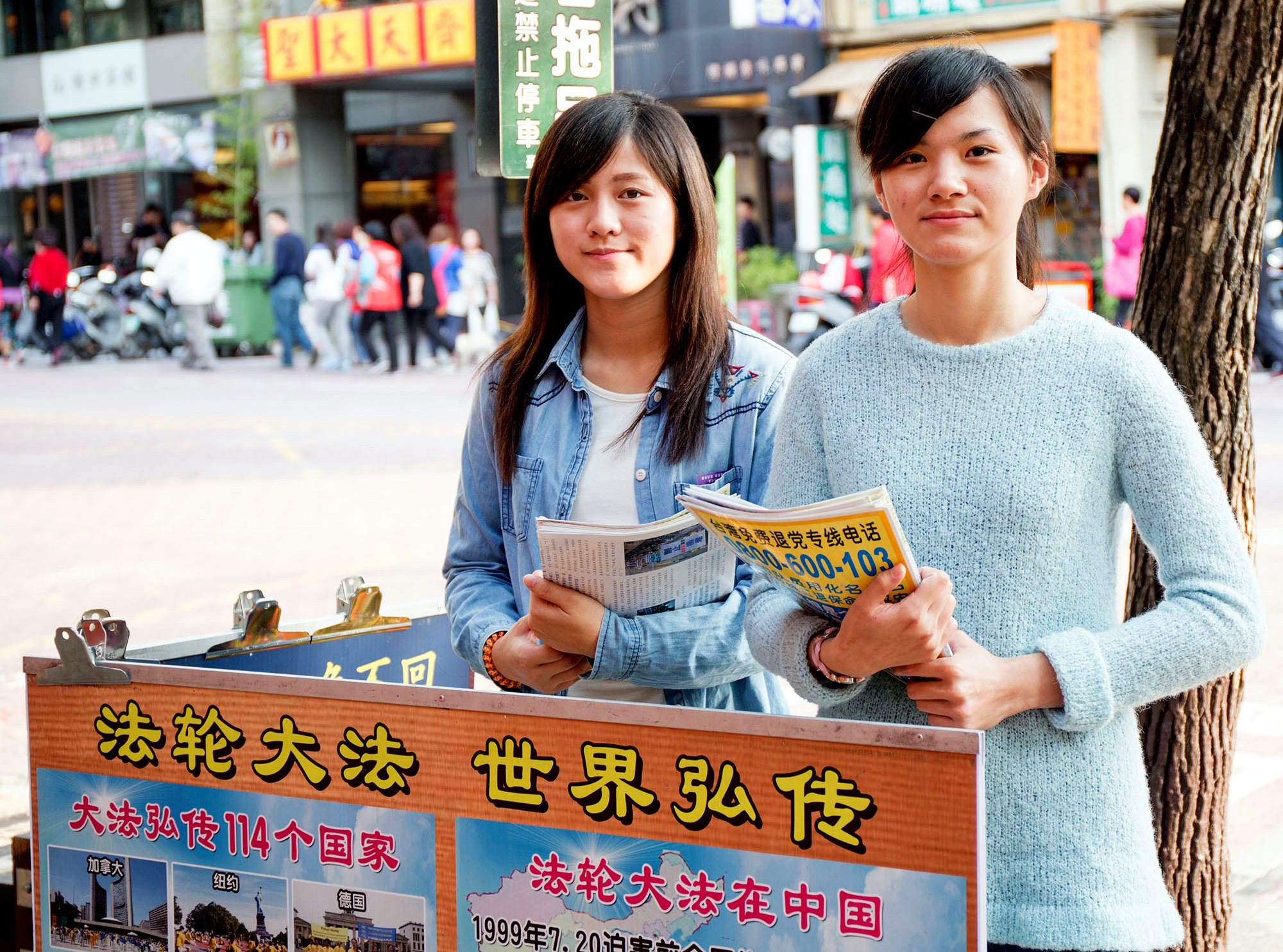 ![]() 还在大学就读的芳纶(右)和庭誉(左),心系大陆众生,两人相约每星期二没课时一起来赤崁楼讲真相。 |
