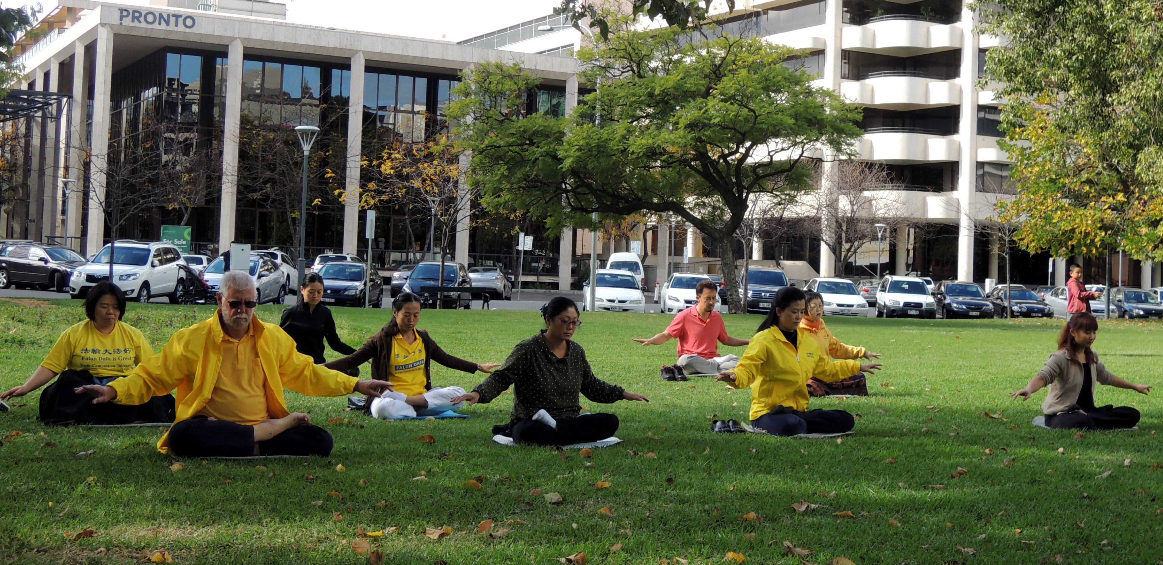 ![]() 法轮功学员在阿德莱德的Hindmash广场展示功法 |