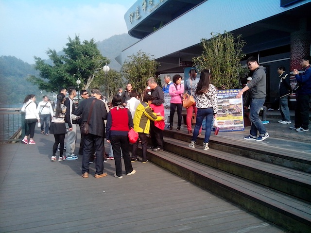 担任教职的李女士则是利用空闲时间到日月潭去给中国人讲真相,她也提到越来越多的中国人有勇气敢于正义的发声。最近,他们一行人如同以往一样到伊达邵码头炼功、举展板、派发资料。刚开始没多久,就听到有人大喊一声:“法轮功是中国人的荣耀!”一位大陆游客上了伊达邵码头,看到他们就大声的喊出。李女士听了特别有感触,因为明白的中国人越来越多,他们不只自己声明退出曾加入的共党组织,而且会为他人说明,协助他人了解,并敢于大声的说出内心的感受。