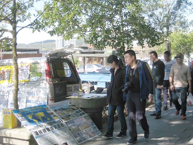 ![]() 学员在伊达邵游客中心举真相展板,大陆游客在休息、等待时会驻足观看。 |