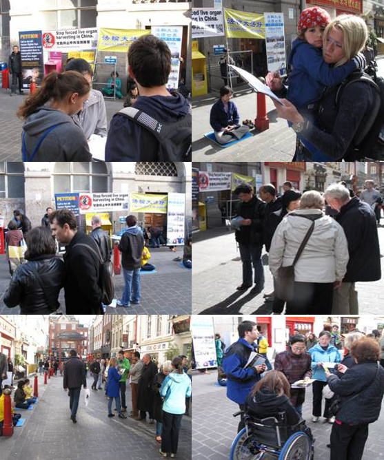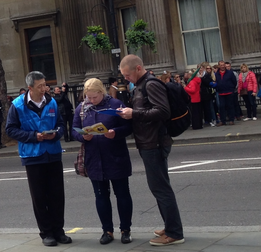 当天,英国法轮功学员同时在伦敦市中心圣马丁广场和唐人街两处举行讲真相、反迫害活动,在不同的场地以宁静祥和的法轮功功法展示、打出中英文横幅的同样方式把法轮功基本真相鲜明、生动地展示给每一个有缘相遇的世人:“法轮大法好”、“法轮大法弘传世界”、“中共对法轮功迫害已十五年、立即停止迫害”、“请伸出援手制止中共活摘法轮功学员器官罪行”。这些醒目的横幅吸引了路人和游客的目光,不少人驻足认真观看真相展板,许多路人纷纷接过法轮功学员递上的真相传单,还有的与法轮功学员长谈,了解更多真相。