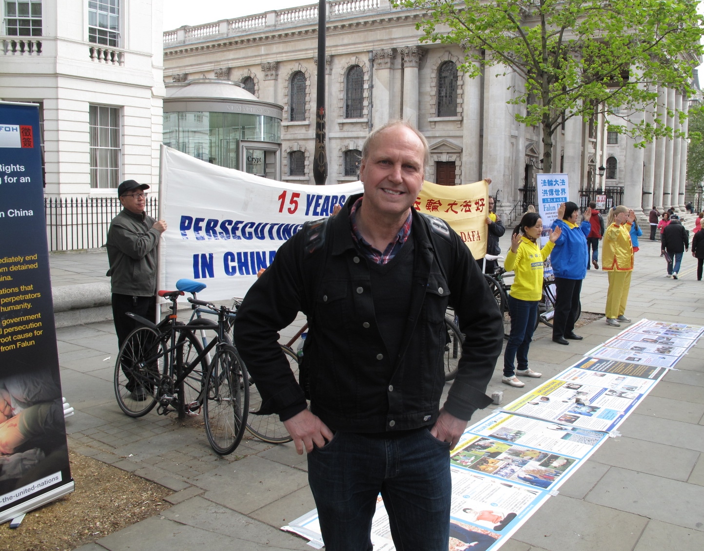 侨居英国二十多年的华人艺术家万先生在伦敦唐人街遇到了举办纪念“四•二五”十五周年活动的法轮功学员。他在海外通过独立媒体和接触认识法轮功学员等途径逐步了解法轮功,自称是“法轮功之友”。他认为十五年前的法轮功“四•二五”万人和平上访开创了历史,而且法轮功信仰代表着中国的希望。
