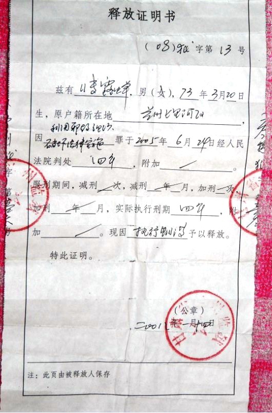 最后,五个哈密恶警只好叫110巡警,才将张露蝉抬上警车。到了兰州市国安局,警察给张露蝉戴上黑头套,劫持到龚家湾派出所,铐在铁椅子上,头套不拿去。派出所警察看不过,说:“到了我们这,我们有权拿掉头套。”头套这才拿掉。当晚,张露蝉又被永登县公安局政保科警察带走,非法审讯了一夜,没人给饭吃。张露蝉不予配合,拒绝签字。第二天十点,政保科接到上级电话,归还了所有东西,让家属将他接回。