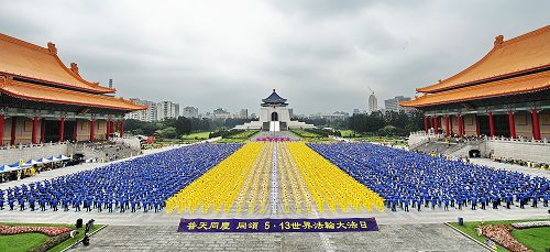![]() 图1-4:二零一四年台湾逾六千人于自由广场排字、炼功,欢庆世界法轮大法日,场面壮观震撼。 |