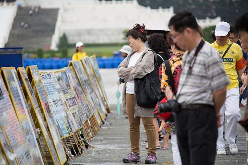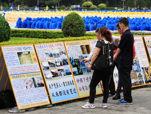设置在排字区一旁的“正法之路图片展”与“真相展板”让过往游客在观赏排字之余,也有机会深入了解世界各地法轮功学员多年来洪法、讲真相的历程。来自英国的Robin Whitwell是位电脑工程师,他在一旁观看法轮功学员排字很久,并主动到真相展板前了解事实。