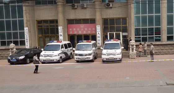 在五月六日鞍山铁西法院开庭前一天,铁西法院就把法院的广场周围用警戒线围起来,六日一早,法院周围布置了大量警察,便衣,法院门前和左右停放十余辆警车。特警在警戒线内每十余米站一个。警戒线内禁止车辆和行人通过。近八时有两辆警用面包车驶入法院后院,车上有法轮功学员商静、郭素芳、张旭、唐超、高素娟、姚元东、龙刚。