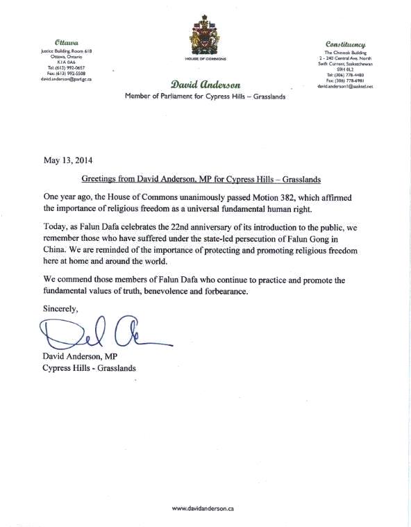 塞浦路斯•希尔-格拉士兰选区(Cypress Hills-Grassland)国会议员大卫•安德森(David Anderson)在贺信中说:“一年前,国会全体通过三八二动议(Motion 382),确定了信仰自由作为普世基本人权的重要性。”
