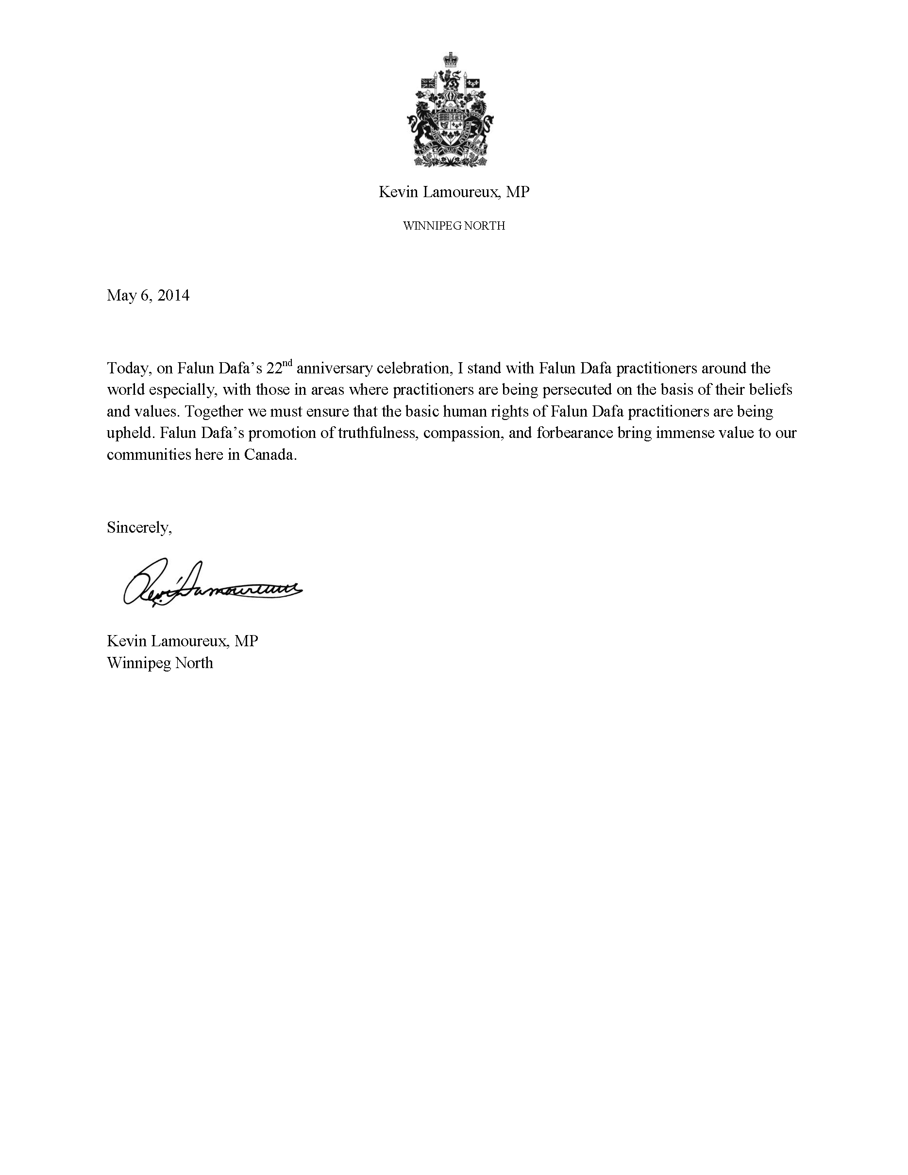 加拿大北温尼伯选区(Winnipeg North)议员凯文•拉莫瑞科斯基(Kevin Lamoureux)向加拿大法轮大法学会发来贺信,信中说:“今天,在法轮大法二十二周年庆典上,我与世界各地的法轮大法修炼者特别是与那些因信仰和价值观遭受迫害的修炼者站在一起。我们必须共同确保维护法轮大法修炼者的基本人权。在加拿大,法轮大法对真、善、忍的提倡给我们的社区带来非凡的意义和价值。”