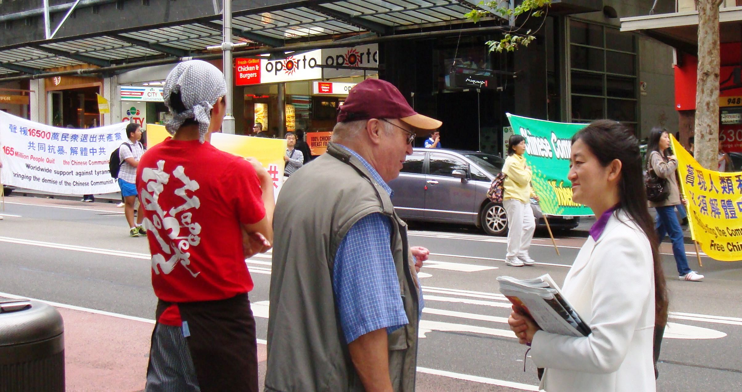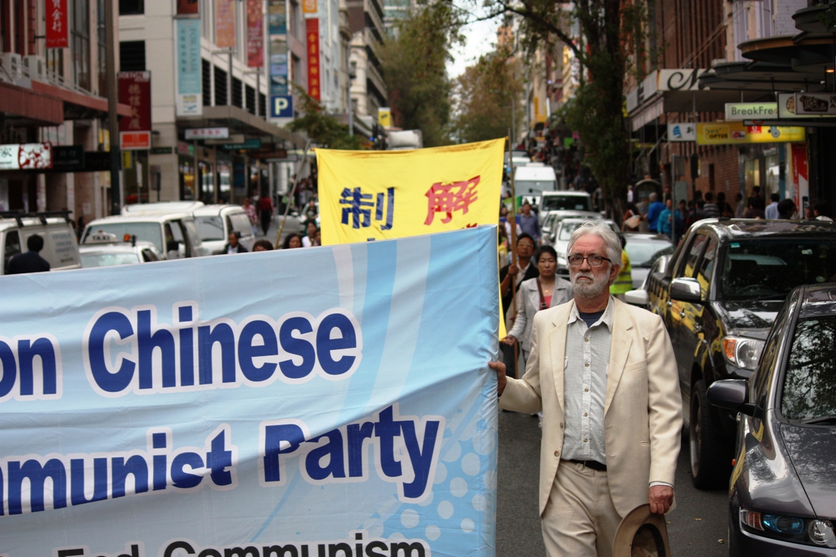 澳洲中国信息网站的创办人、人权活动家鲍勃‧温尼卡姆(Bob Vinnicombe)先生也前来支持并加入游行队伍,他表示:我很自豪能来到这里,举着横幅参加游行,与这些饱受迫害折磨的勇敢的人们在一起,尽我一点绵薄之力,帮助将发生在中国的迫害的信息带给澳洲公众。