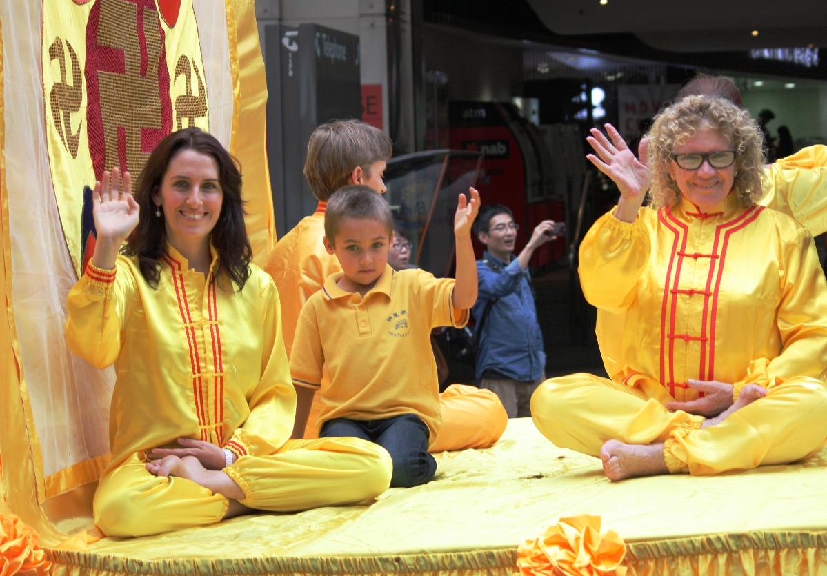 ![]() 中、西方学员们在莲花车上向路人演示五套法轮功功法 |