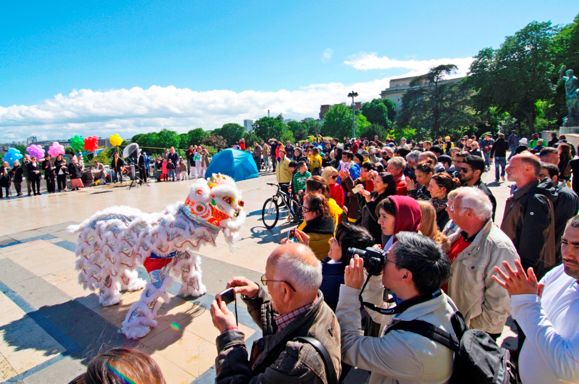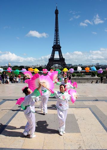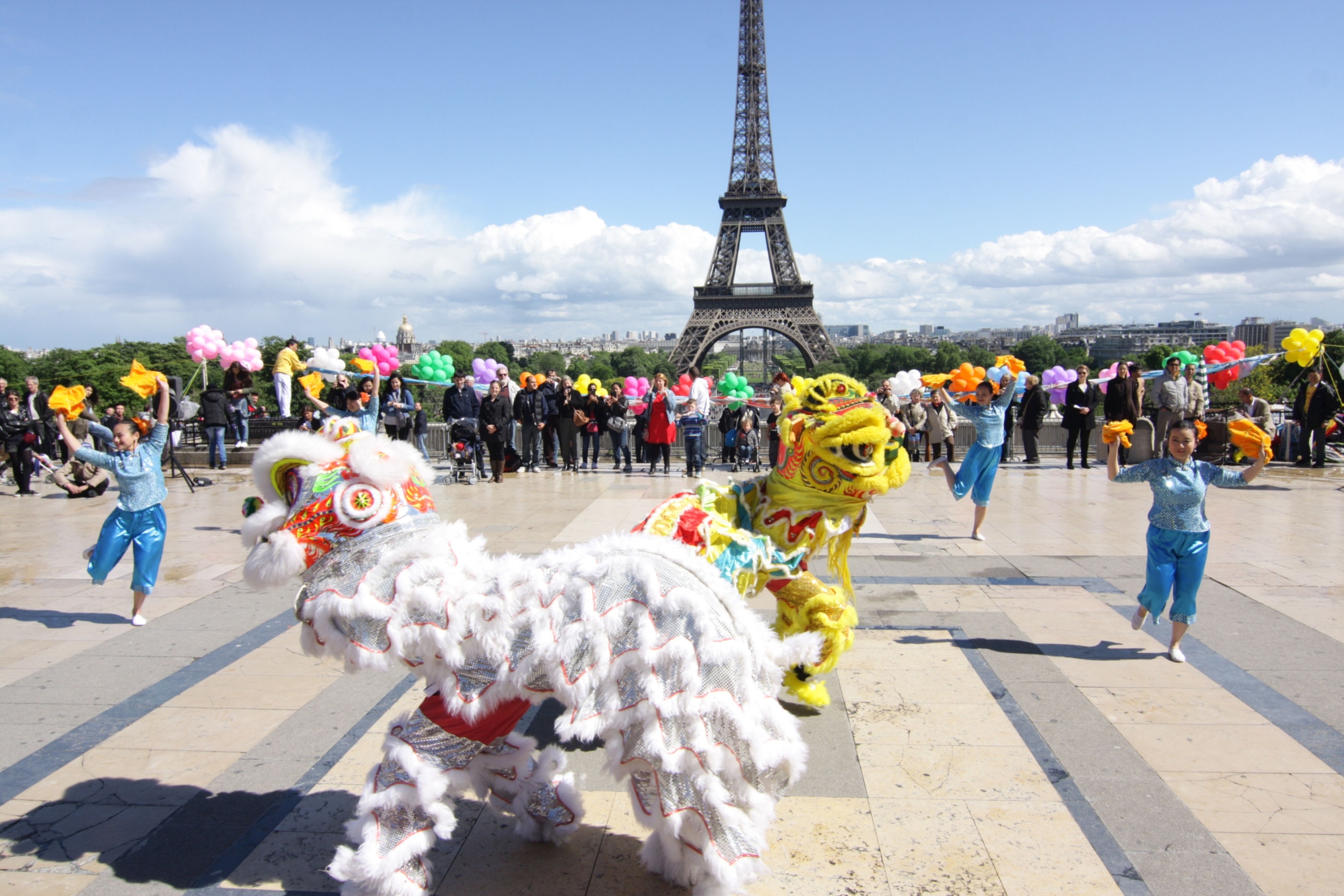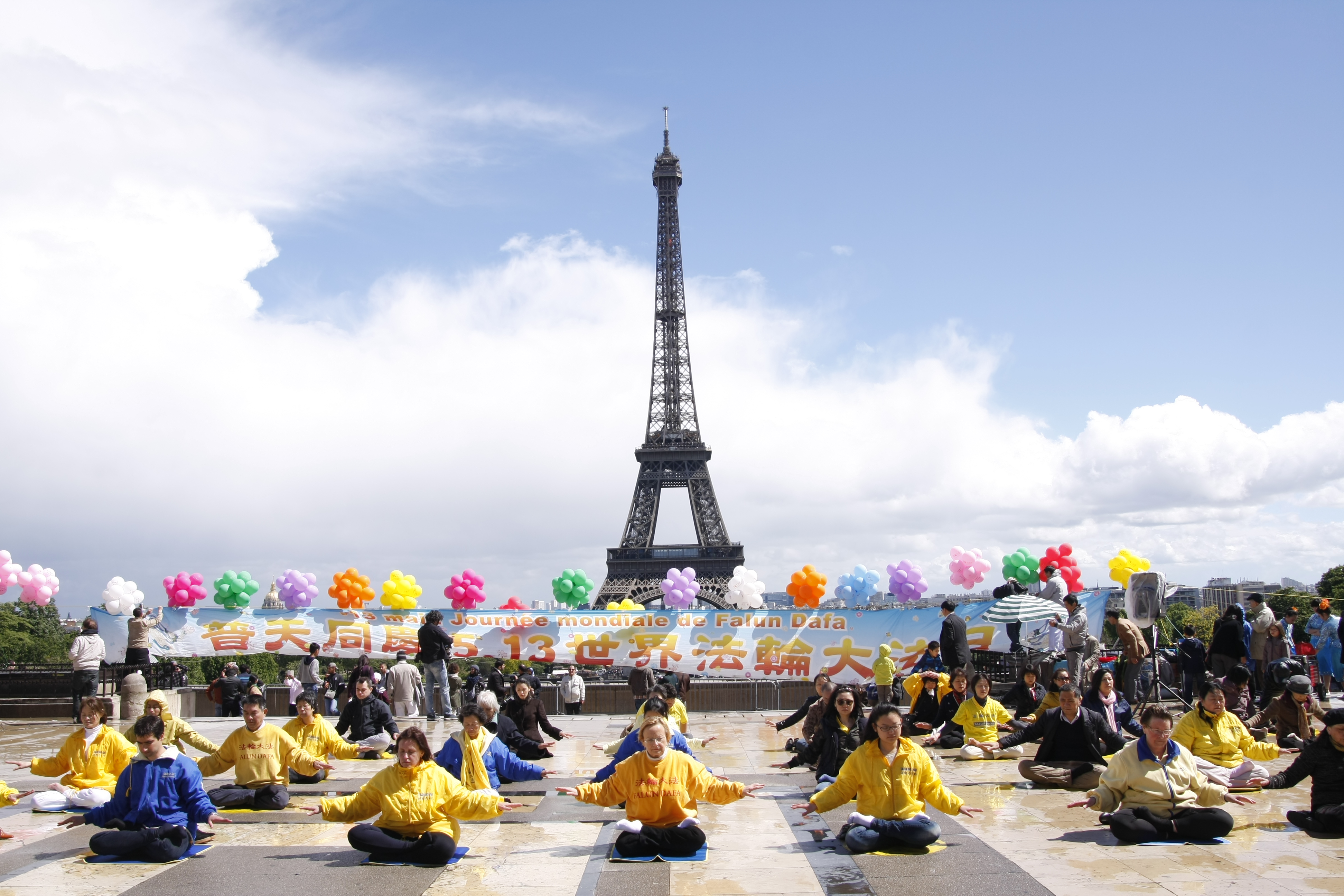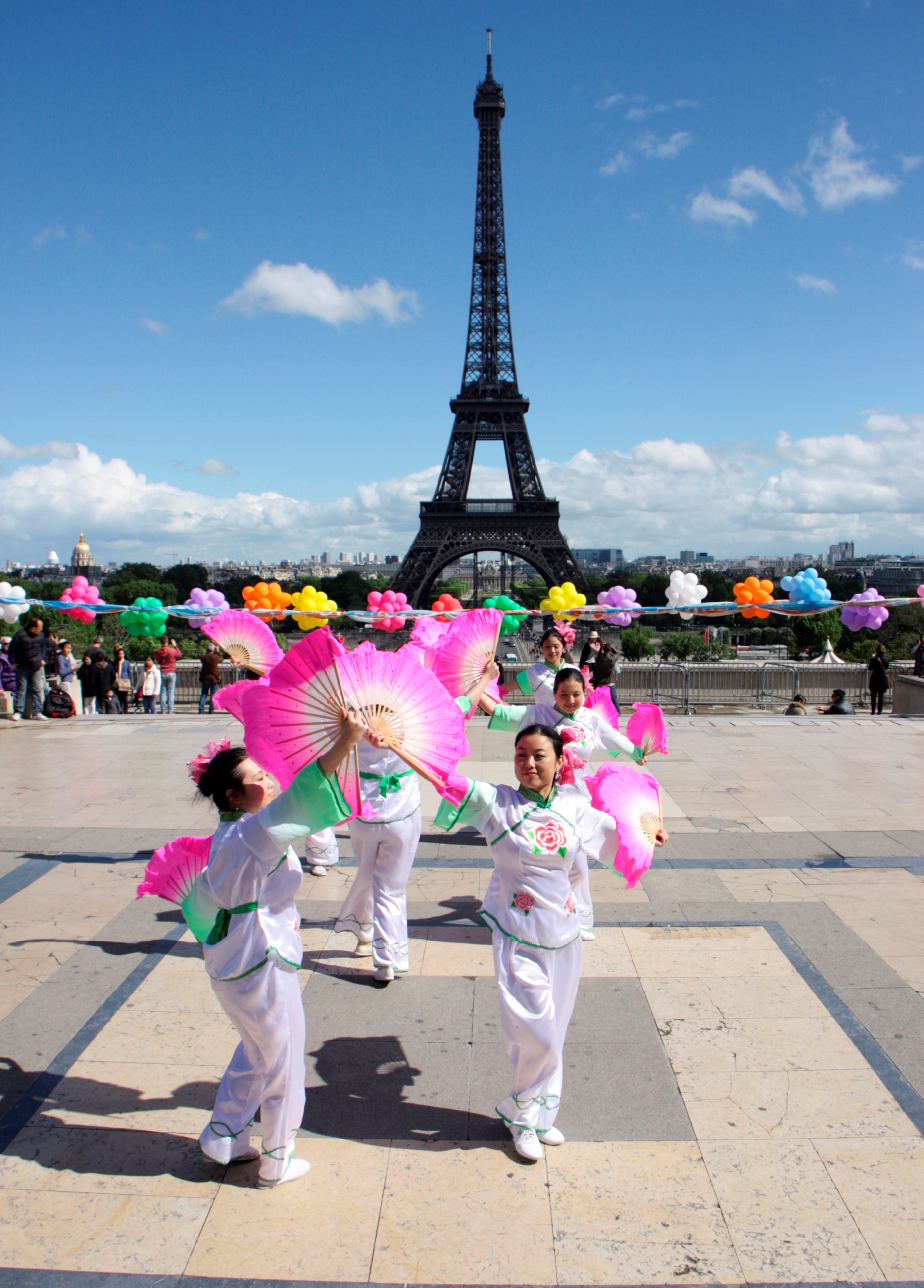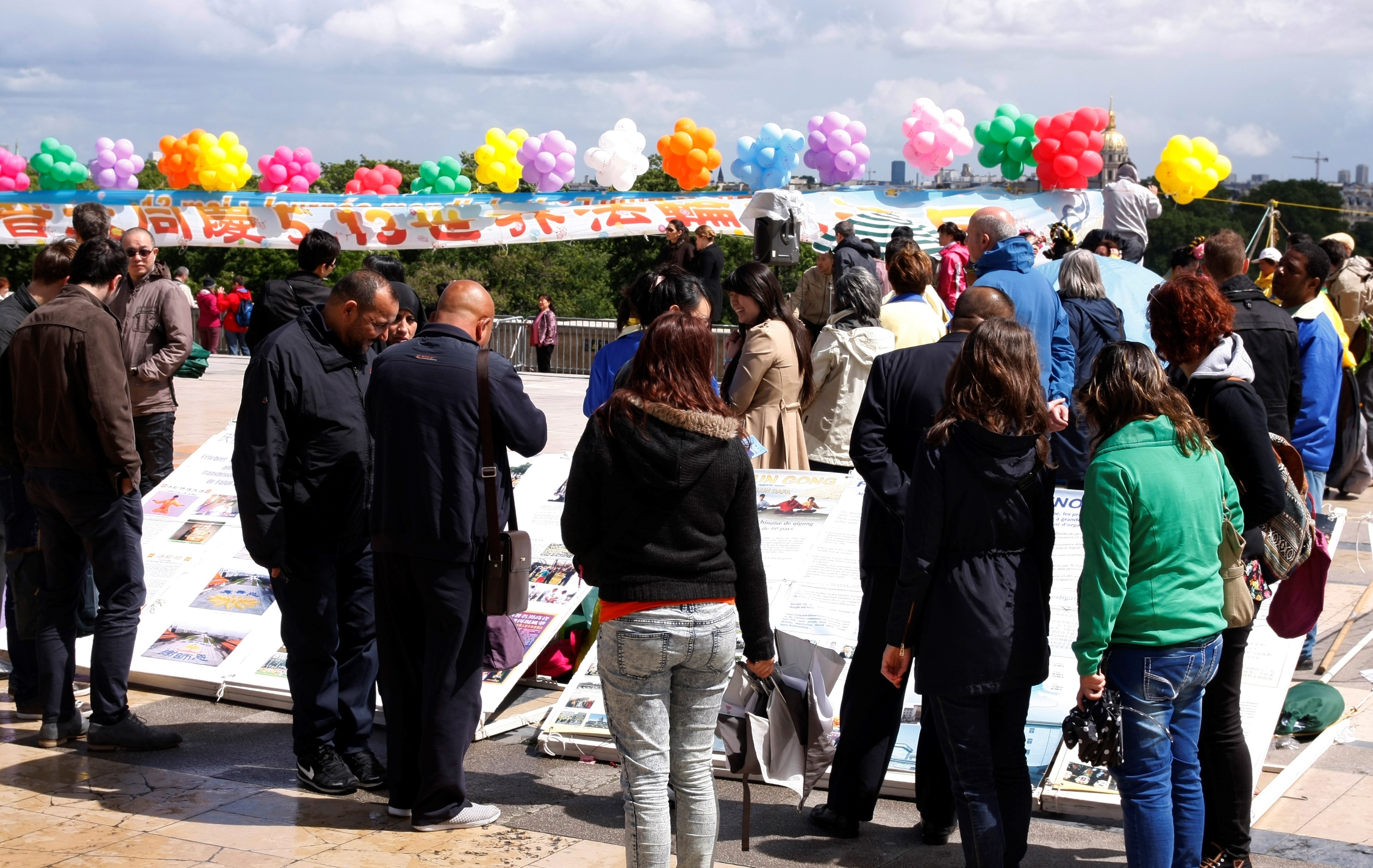 二零一四年五月十一日星期日下午,法国法轮功学员来到埃菲尔铁塔下的人权广场,庆祝法轮大法洪传世界二十二周年。