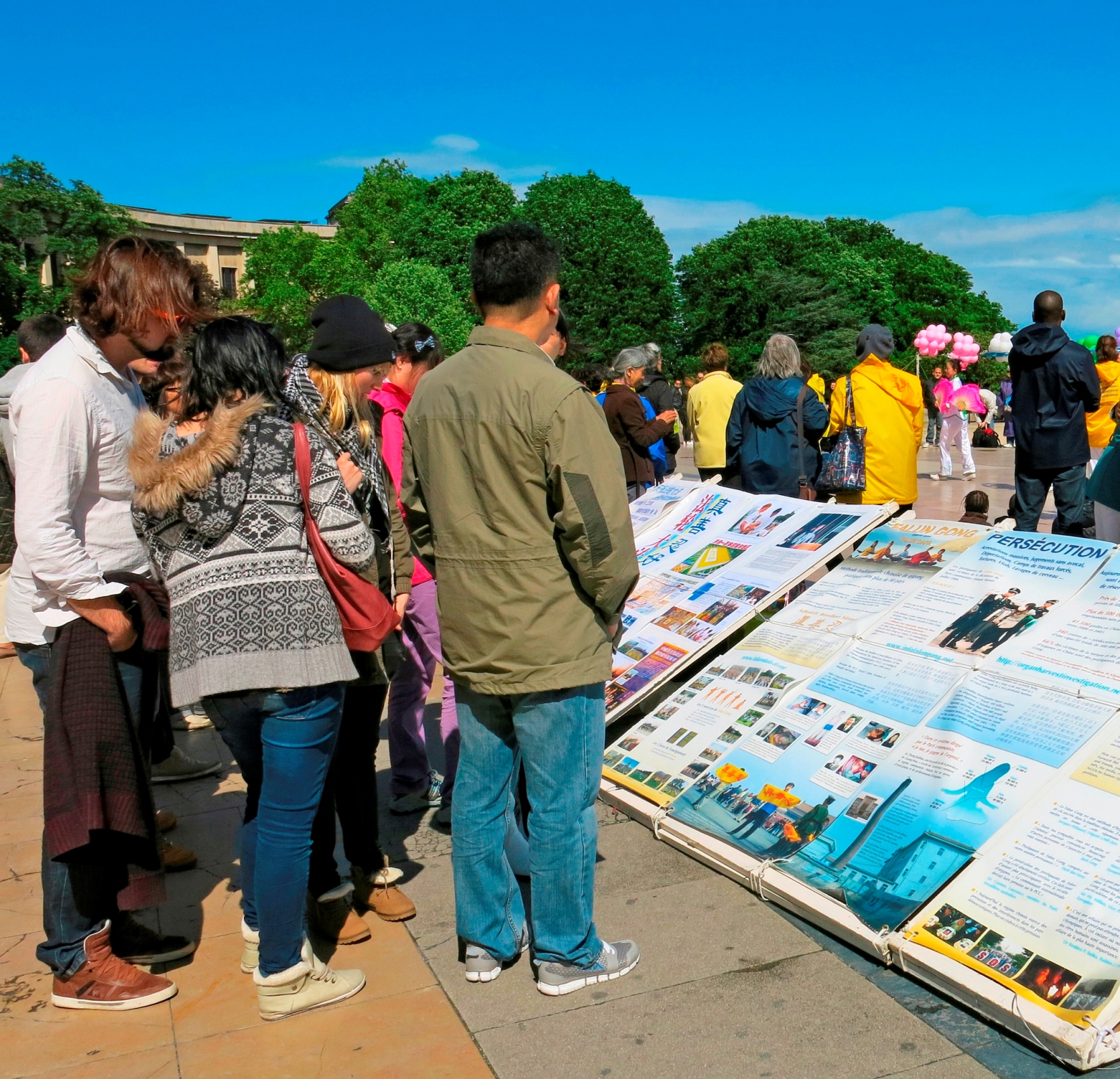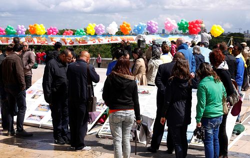![]() 图6-7:广场上的中西方民众观看展板,了解中共迫害法轮功的真相。 |