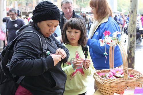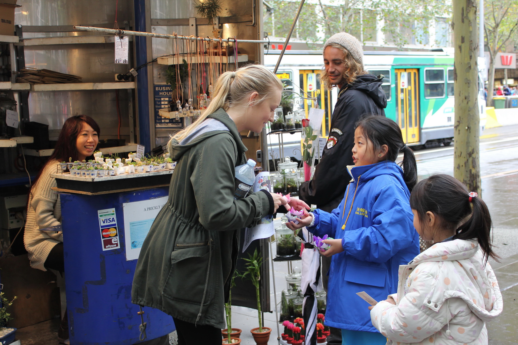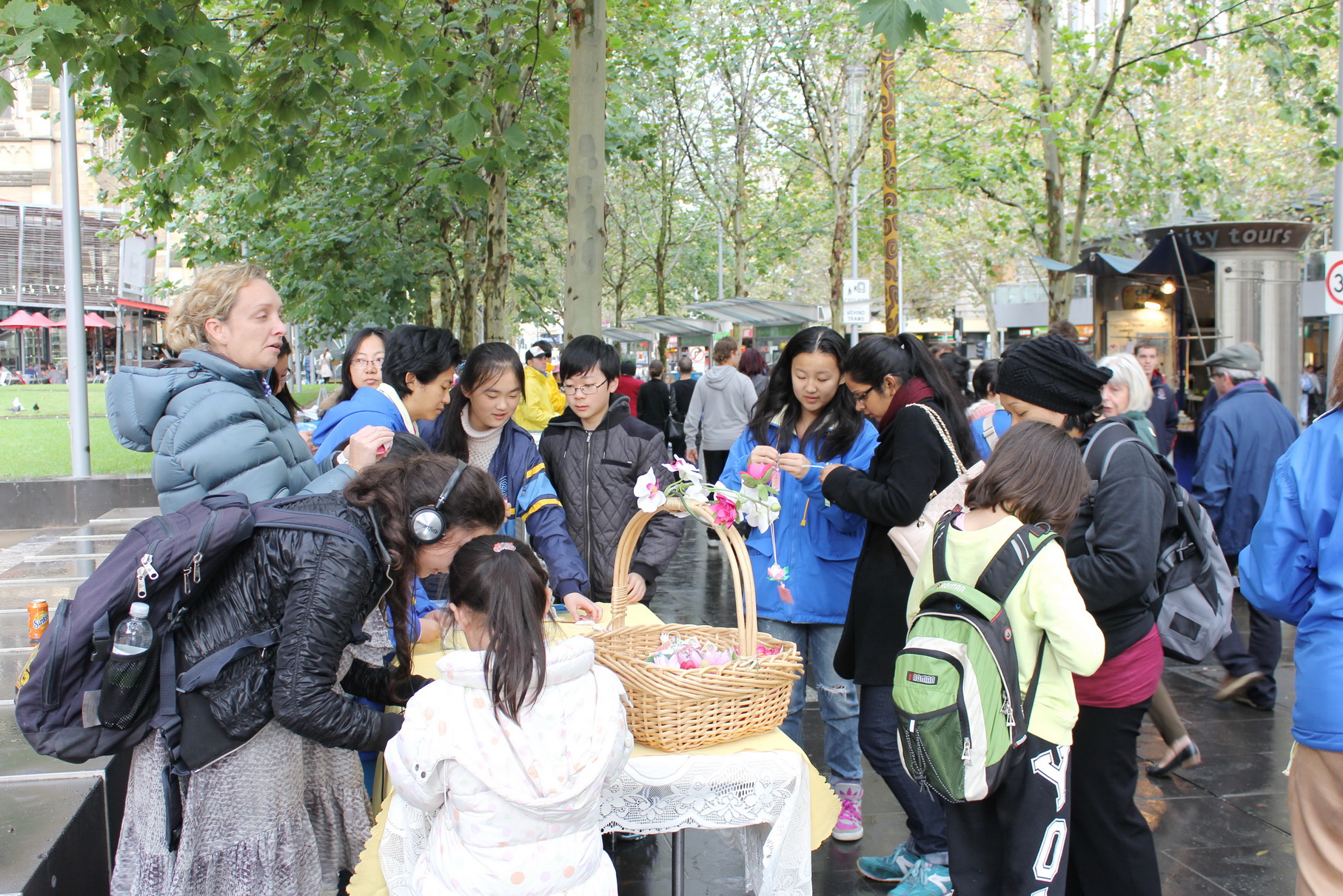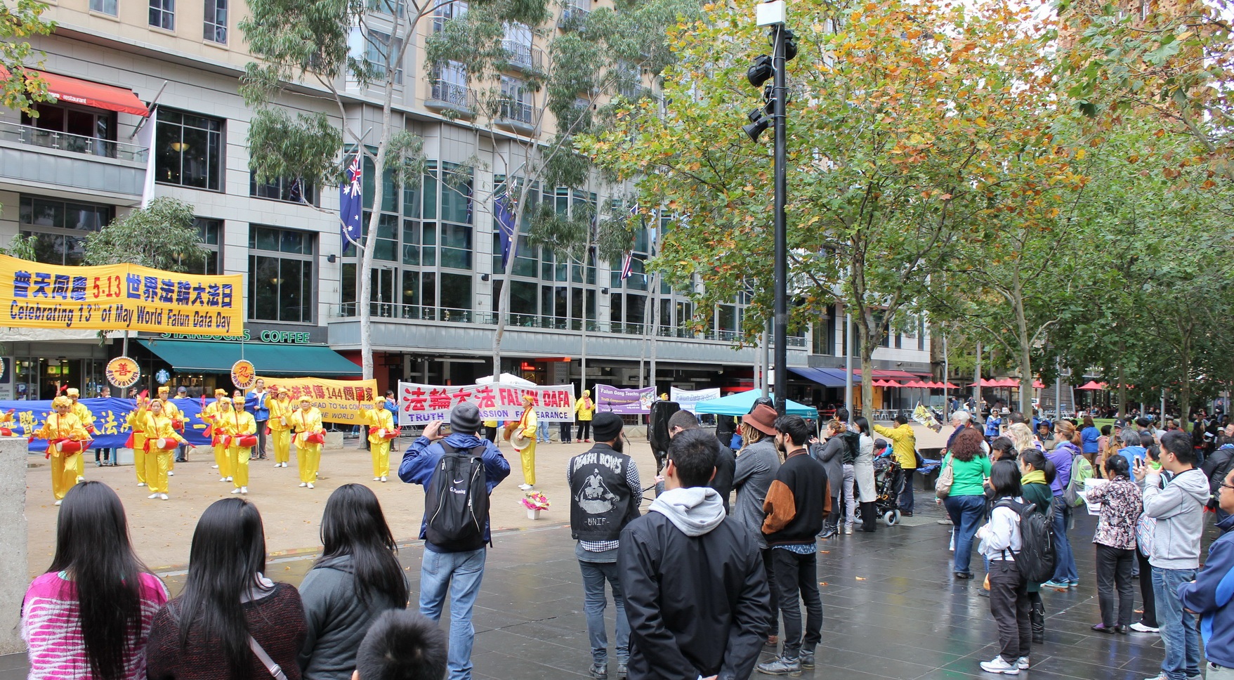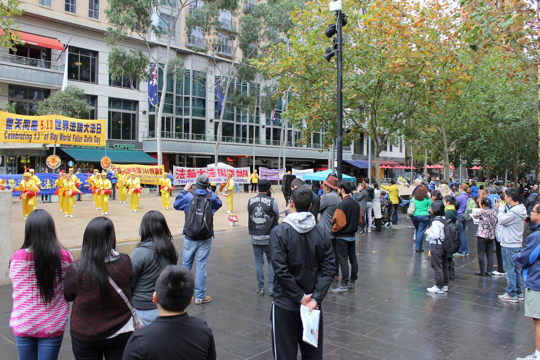活动当天,墨尔本细雨蒙蒙,庆祝活动开始前,市中心的雨暂停了。学员们演示祥和的五套功法、优美的扇子舞、欢快的腰鼓、以及童声独唱等节目,吸引路人驻足观赏、拍照留念。美丽的纸折莲花,不仅吸引了女士,也让不少绅士细细观赏。