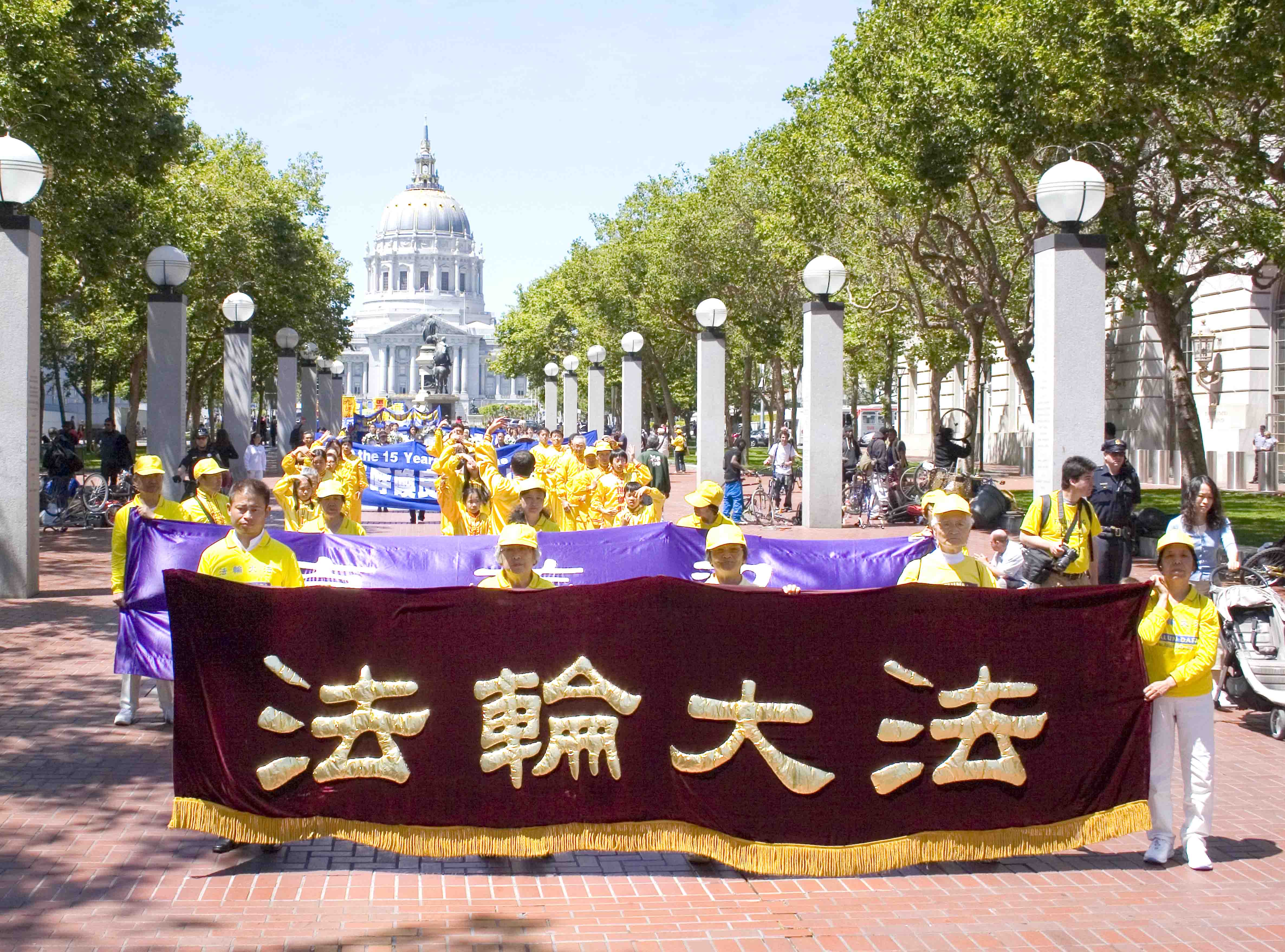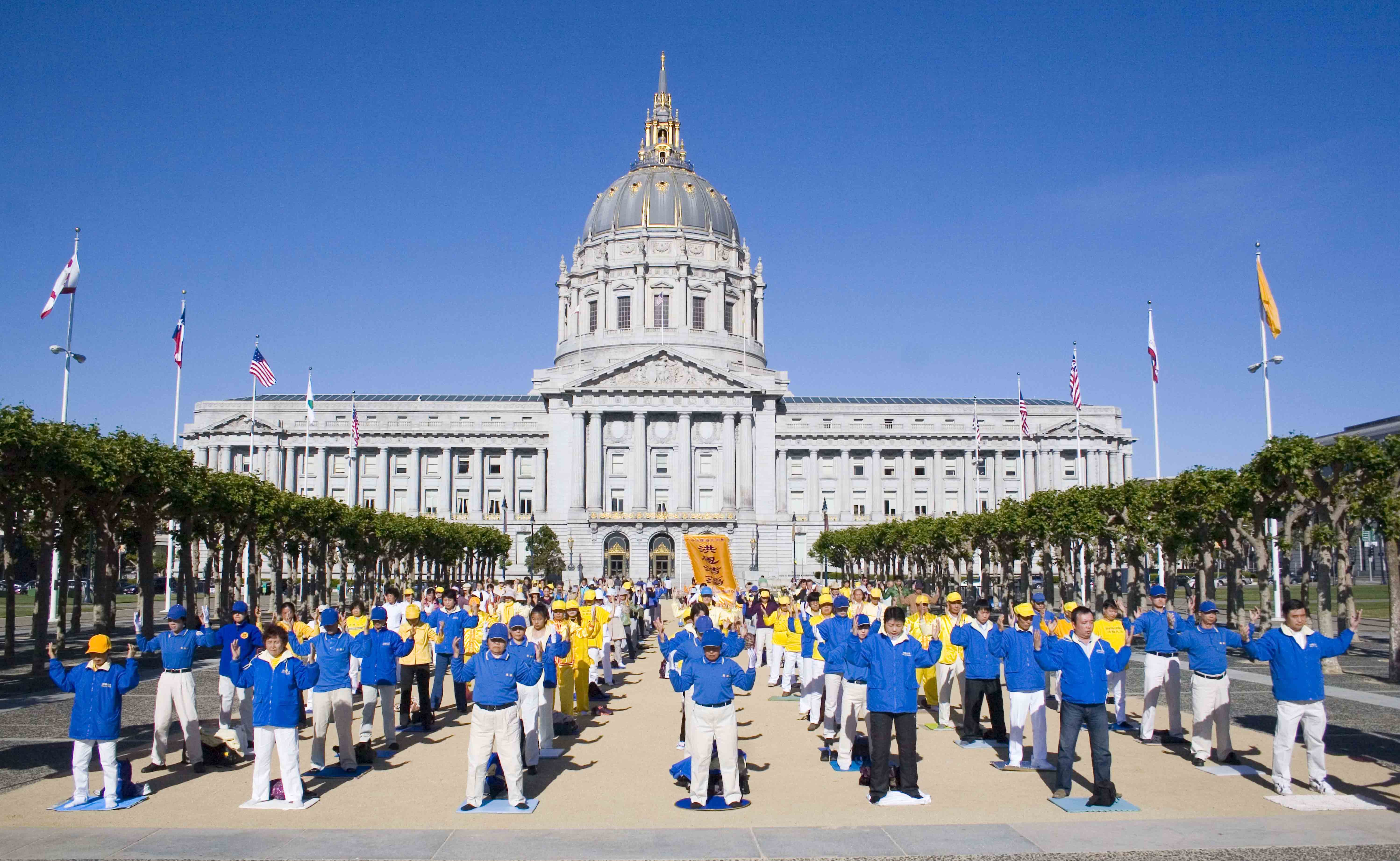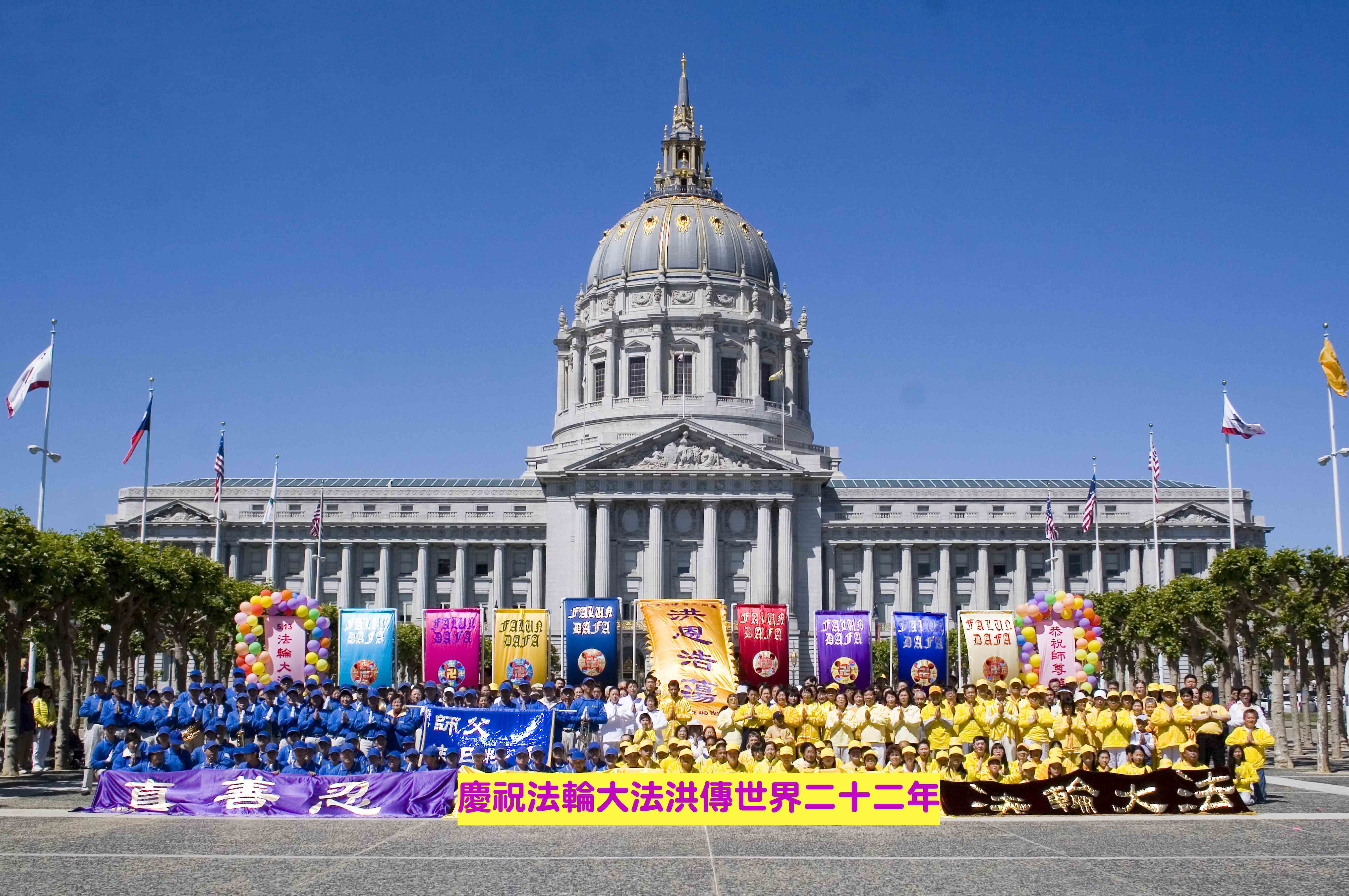 星期六,旧金山阳光明媚、晴空万里。市政广场彩旗飘飘,现场气氛祥和喜庆。法轮功学员炼完功后,在市政厅前整齐排列,恭敬合十,齐声念颂:“恭祝师父生日快乐!”“法轮大法好!”
