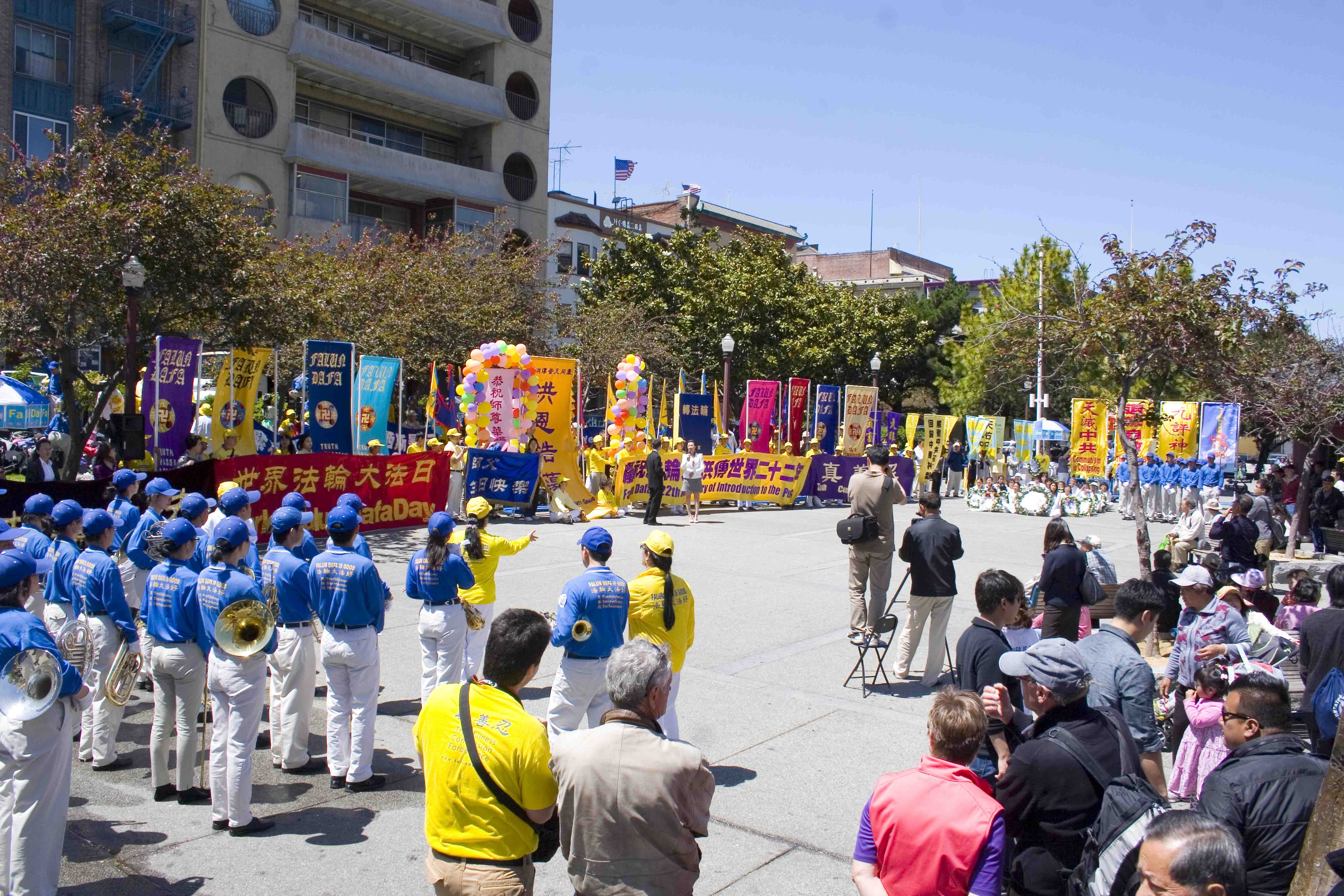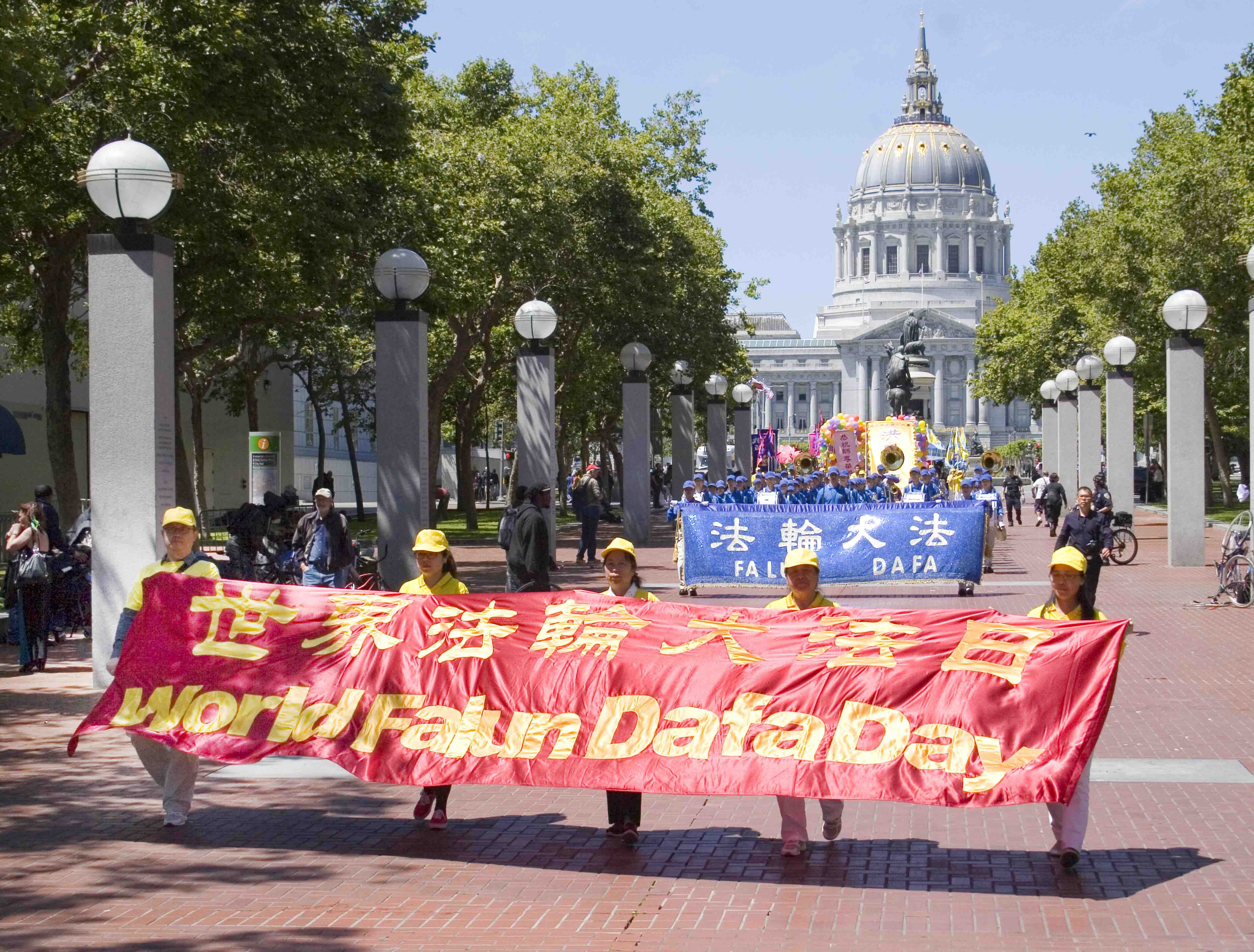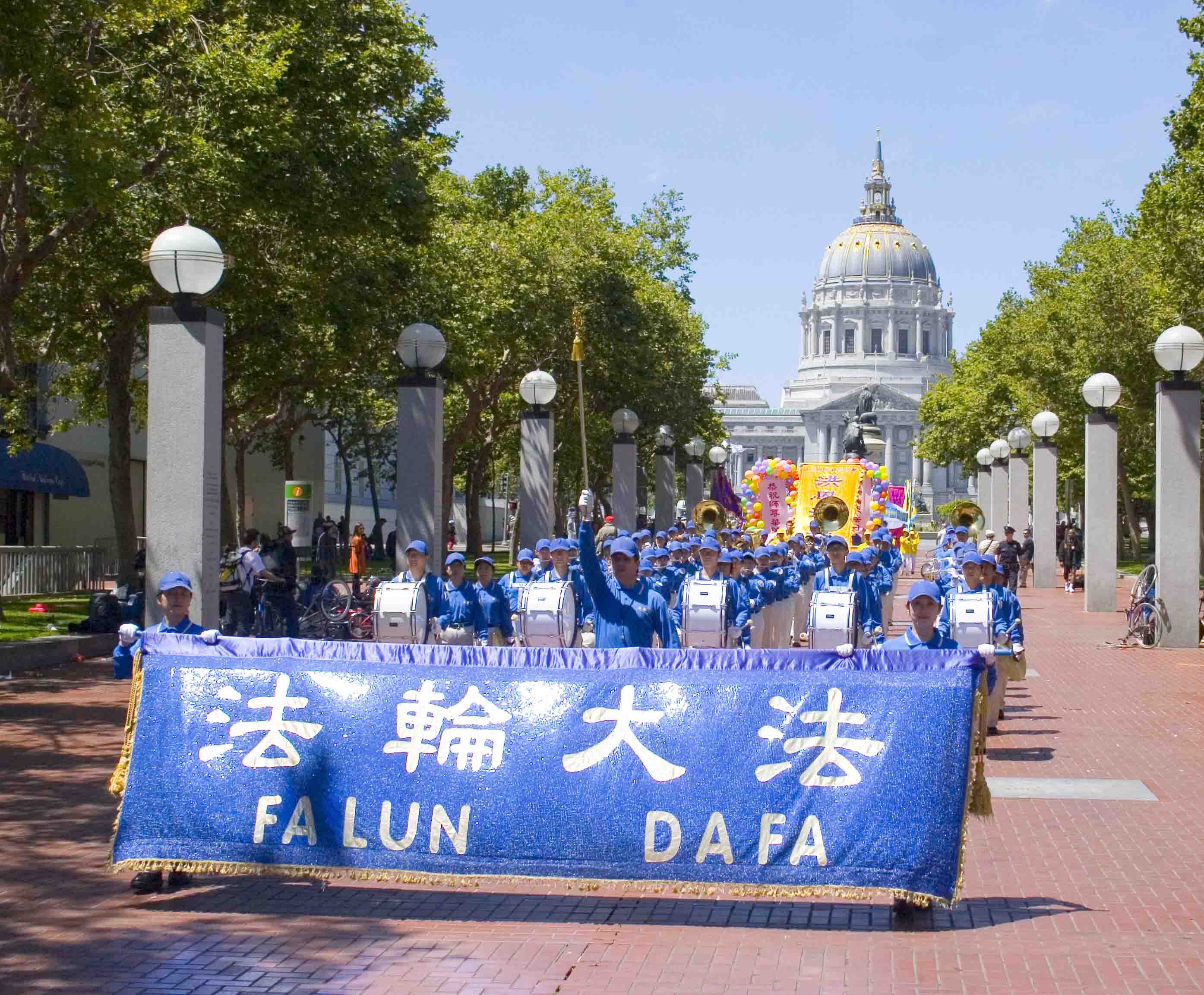 星期六,旧金山阳光明媚、晴空万里。市政广场彩旗飘飘,现场气氛祥和喜庆。法轮功学员炼完功后,在市政厅前整齐排列,恭敬合十,齐声念颂:“恭祝师父生日快乐!”“法轮大法好!”