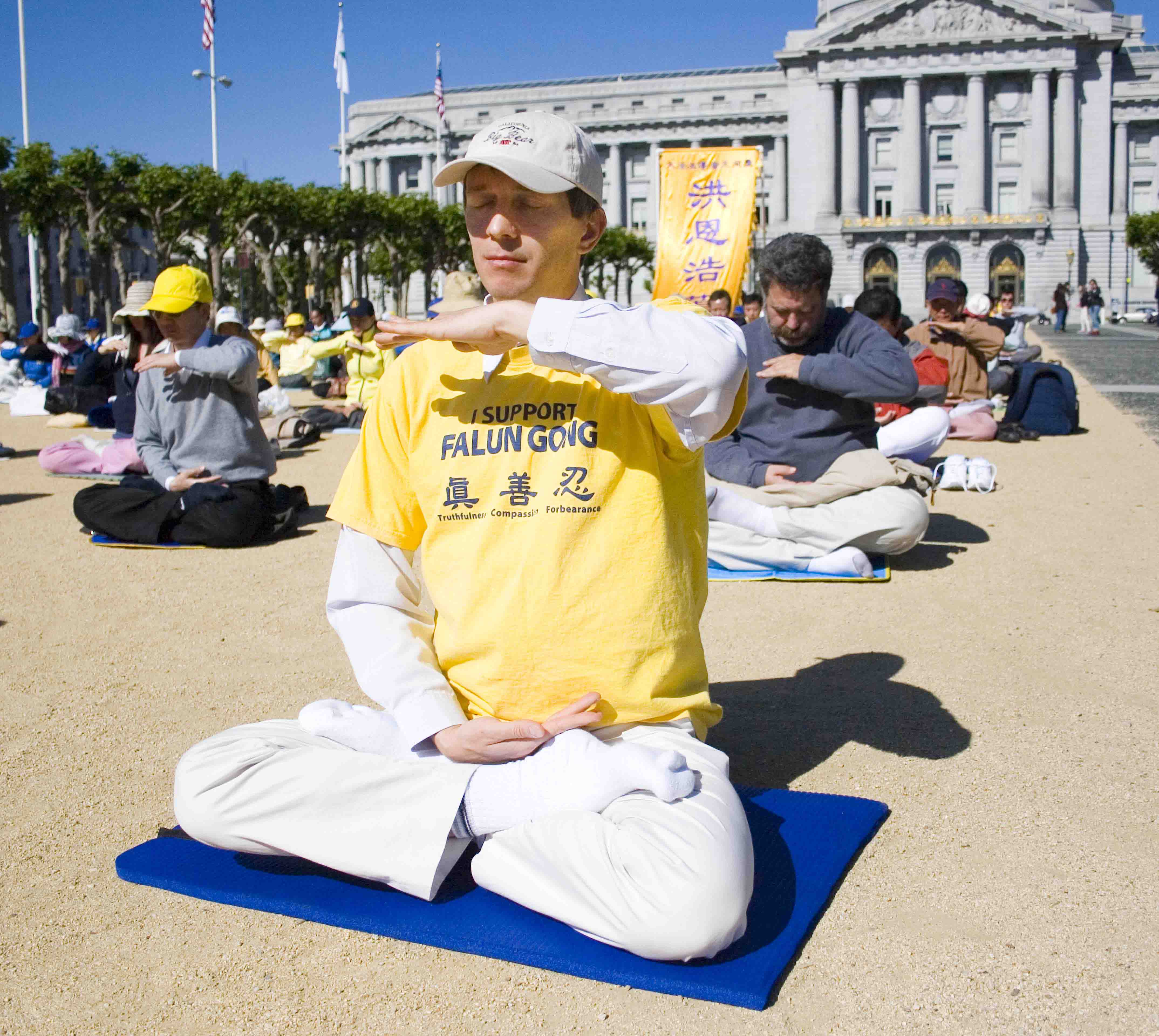 ![]() 法轮功学员在市政厅广场炼功 |