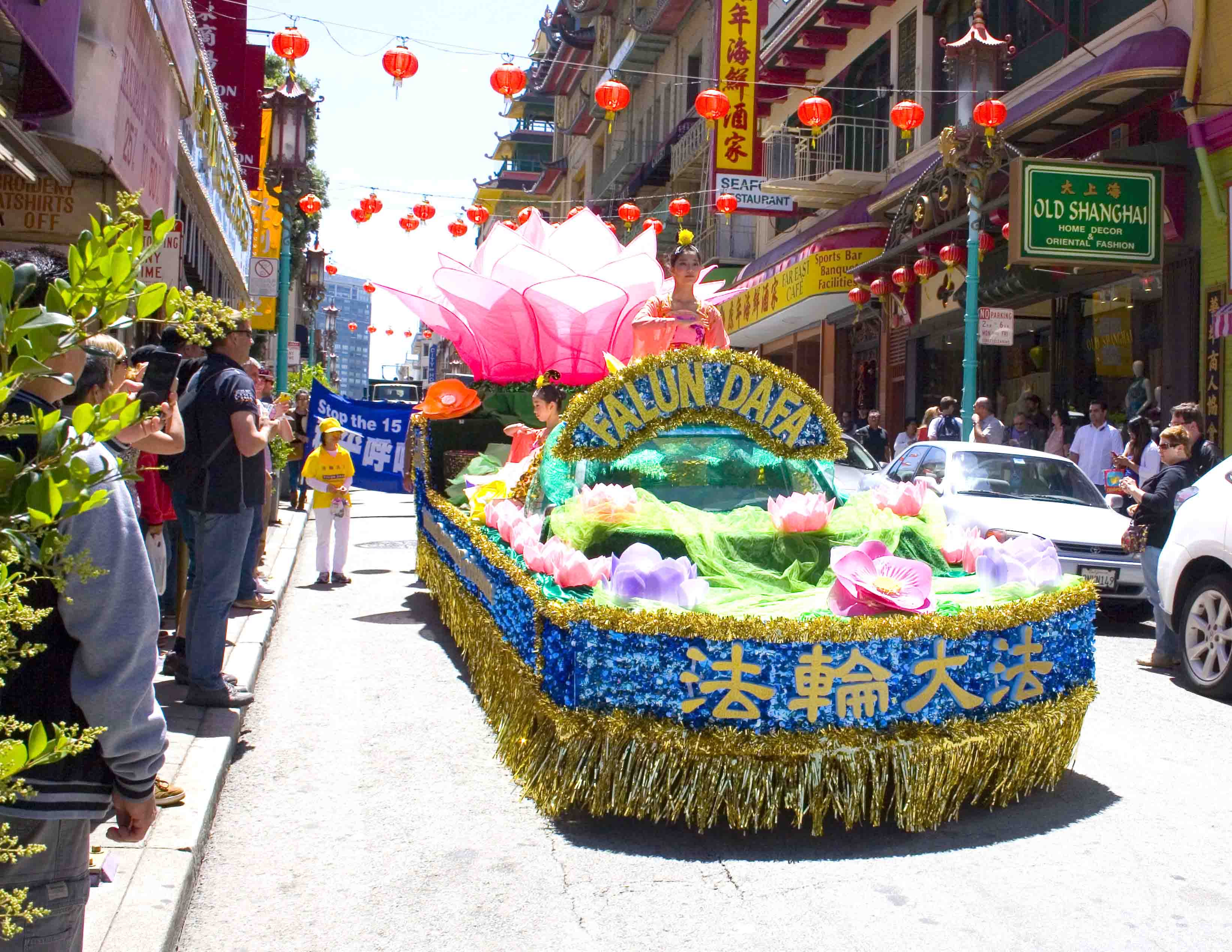 ![]() 法轮功学员装饰精美的花车 |