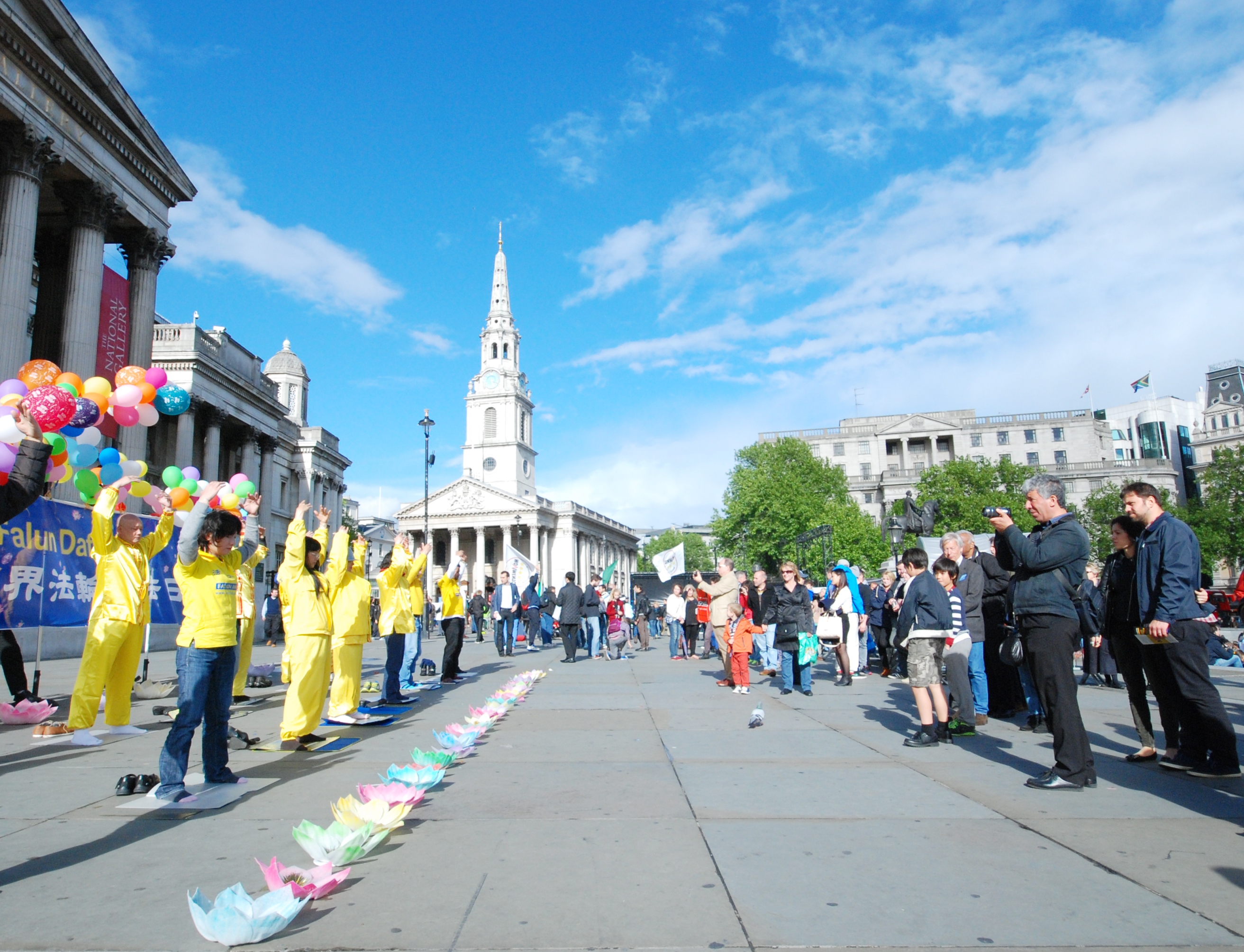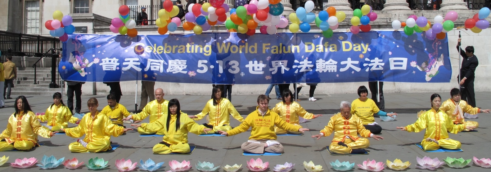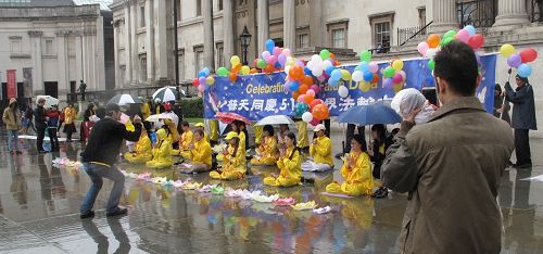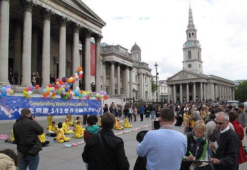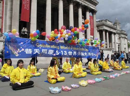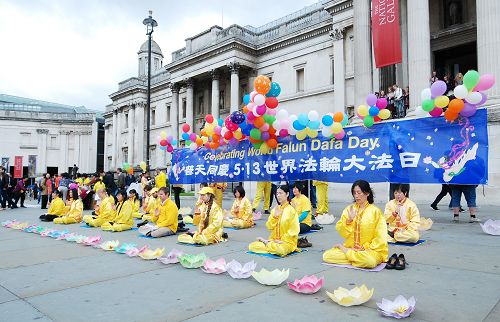 ![]() 二零一四年五月十日,法轮功学员在伦敦鸽子广场庆祝即将来临的世界法轮大法日 |