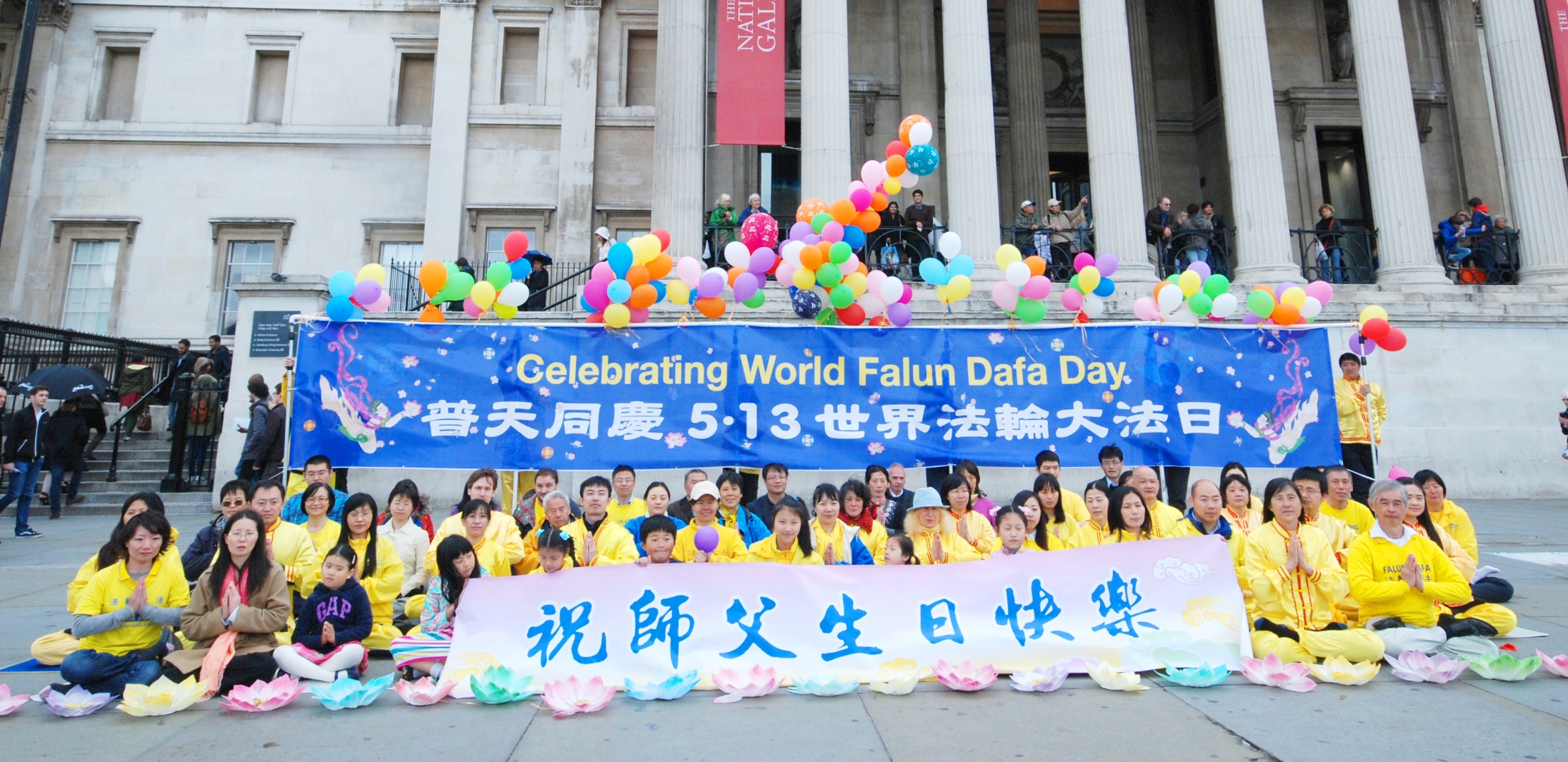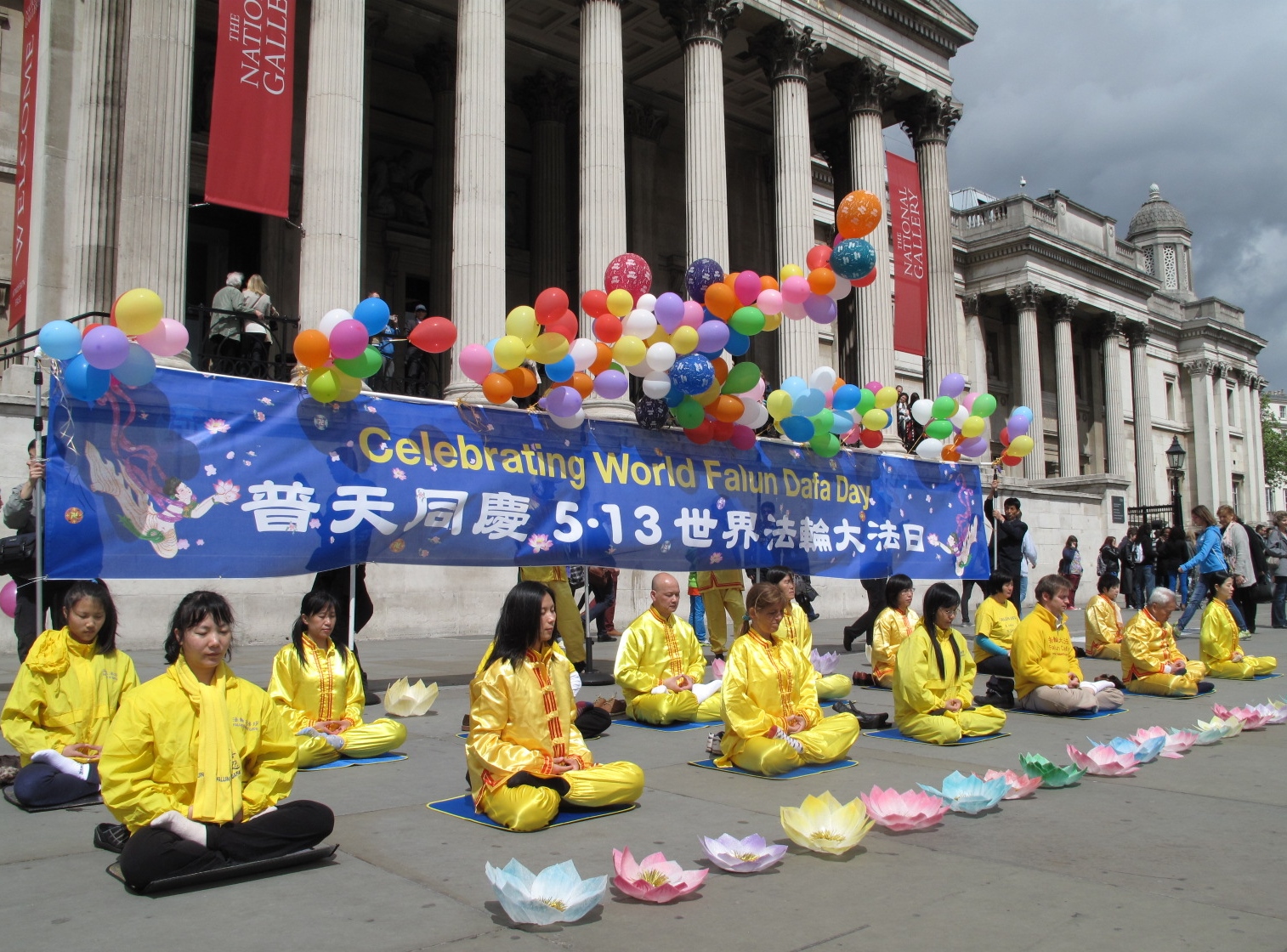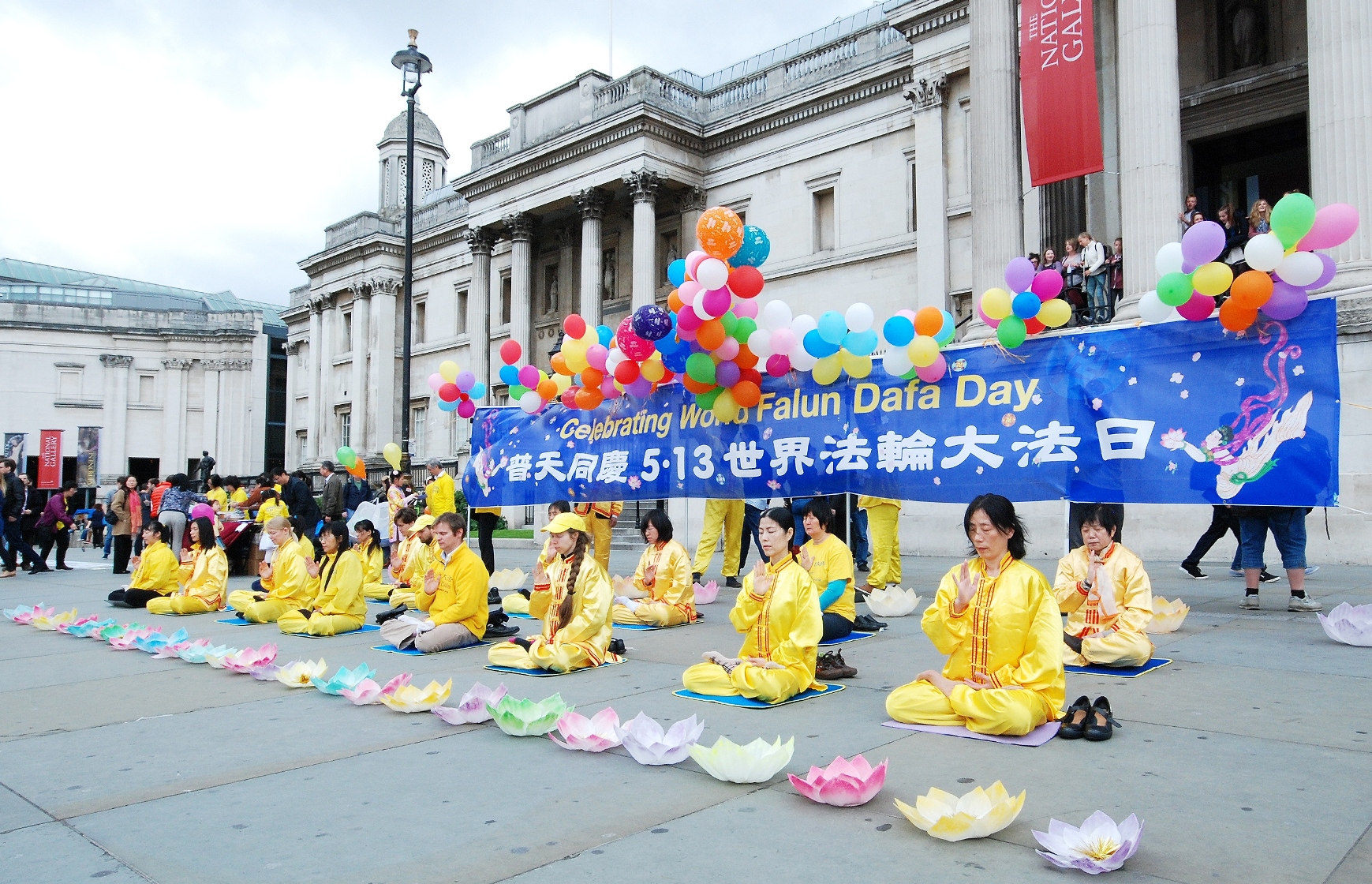 “普天同庆5.13世界法轮大法日(Celebrating World Falun Dafa Day)”,写有中英文的巨大庆典横幅亮丽鲜明,飘在横幅之上的彩色气球如同架在空中的一道彩虹,在横幅前面,法轮功学员重复展示着法轮功五套功法,双眼微闭的祥和面容透着神采。在这些学员身前身后的路面上精心摆放着两排象征纯洁美好的七彩莲花,缤纷的色彩、壮观美好的场面引来无数目光和众多各类拍照(照相机、摄影机、手机……)。进一步吸引人们注意力的还有祥和优美的法轮功炼功音乐、印在横幅上的天女散花和飞旋法轮图案、穿梭在人群中的法轮功学员以及他们发放的真相传单、摆贴在广场路面上的法轮功真相信息系列展板以及学员送出的缀有“法轮大法好”标签的精美手工莲花。