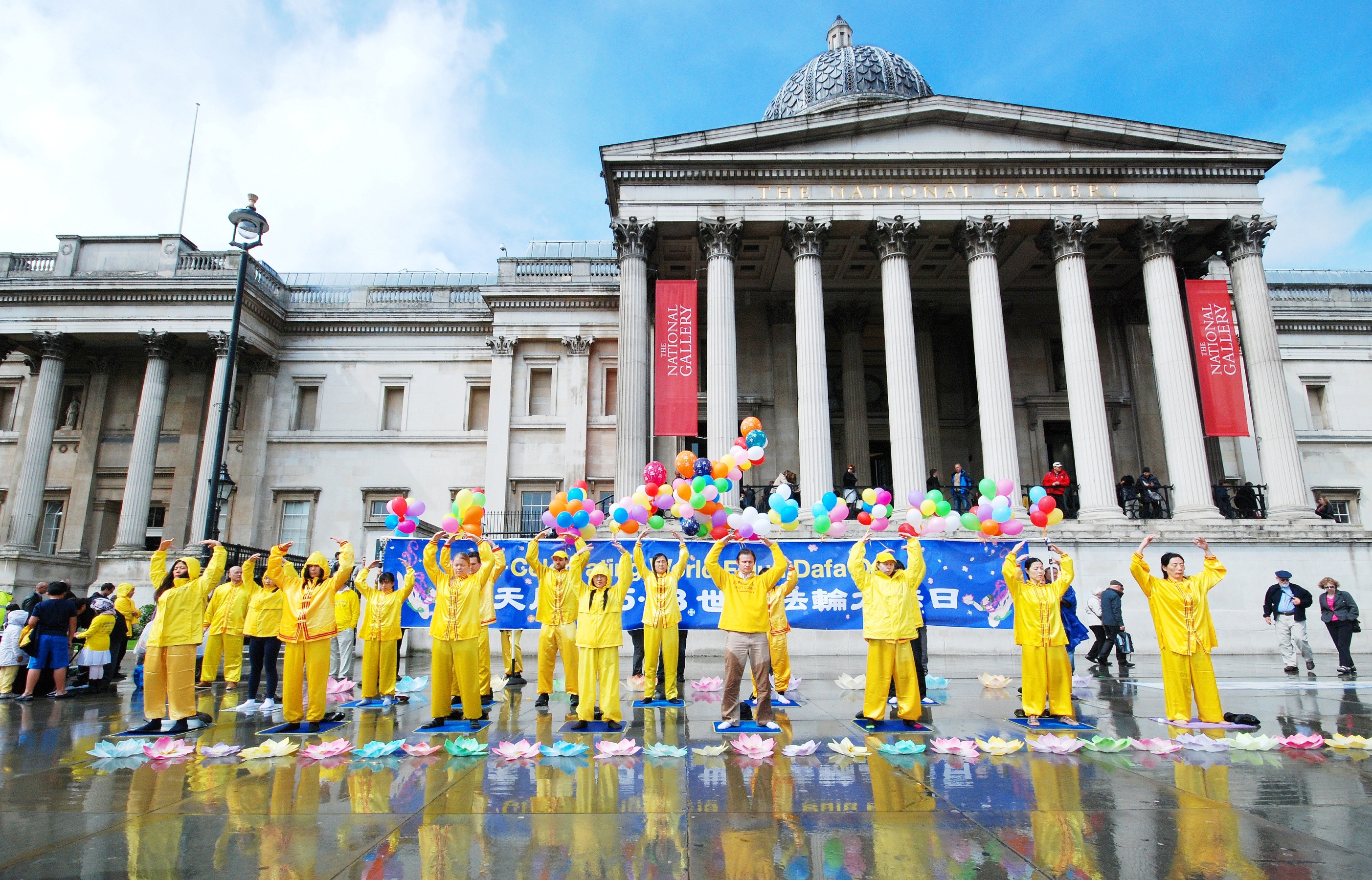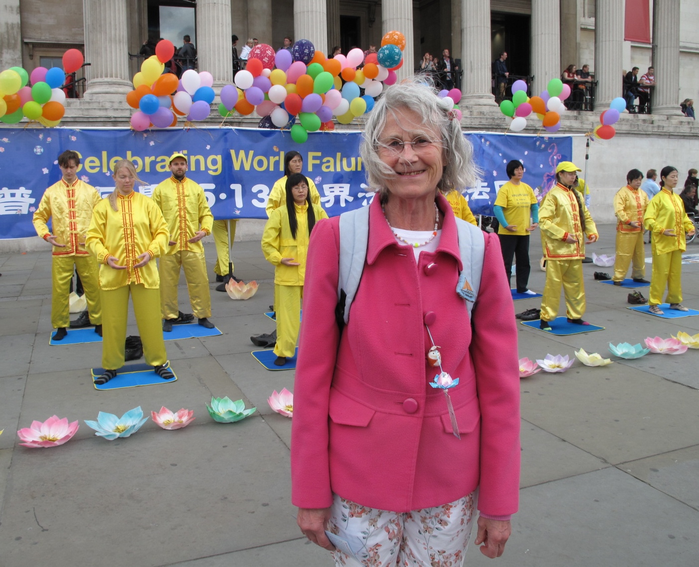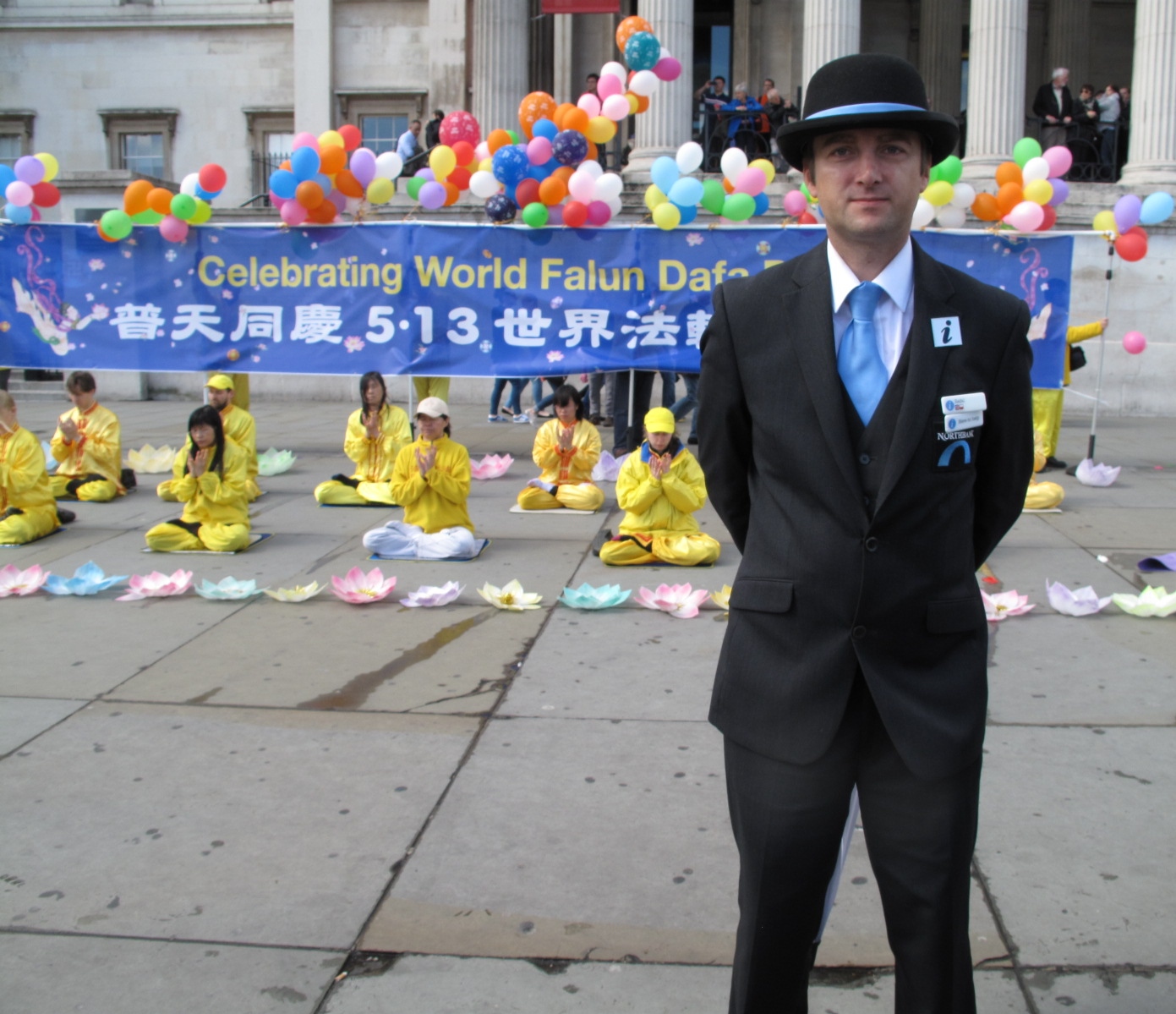 “普天同庆5.13世界法轮大法日(Celebrating World Falun Dafa Day)”,写有中英文的巨大庆典横幅亮丽鲜明,飘在横幅之上的彩色气球如同架在空中的一道彩虹,在横幅前面,法轮功学员重复展示着法轮功五套功法,双眼微闭的祥和面容透着神采。在这些学员身前身后的路面上精心摆放着两排象征纯洁美好的七彩莲花,缤纷的色彩、壮观美好的场面引来无数目光和众多各类拍照(照相机、摄影机、手机……)。进一步吸引人们注意力的还有祥和优美的法轮功炼功音乐、印在横幅上的天女散花和飞旋法轮图案、穿梭在人群中的法轮功学员以及他们发放的真相传单、摆贴在广场路面上的法轮功真相信息系列展板以及学员送出的缀有“法轮大法好”标签的精美手工莲花。