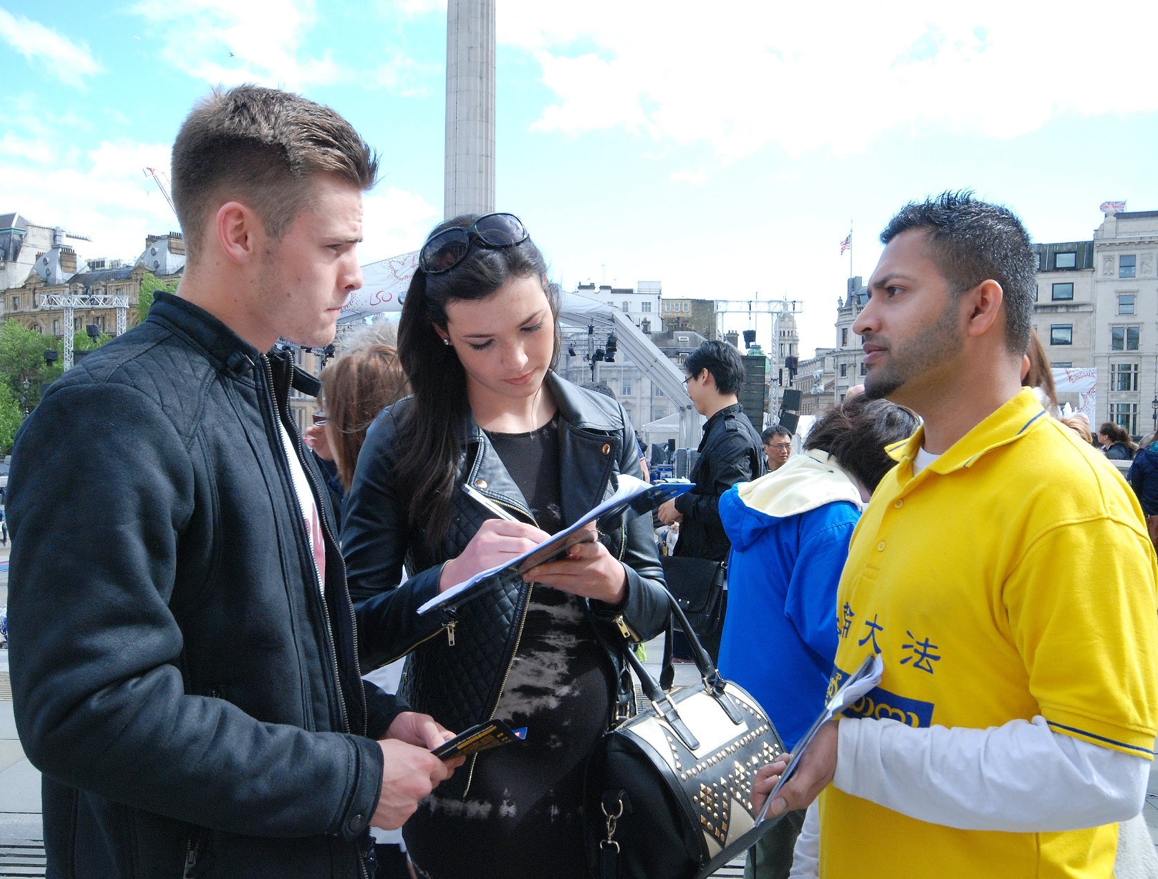 ![]() 法轮功学员在伦敦鸽子广场向来自世界各地的人讲真相传递福音 |
