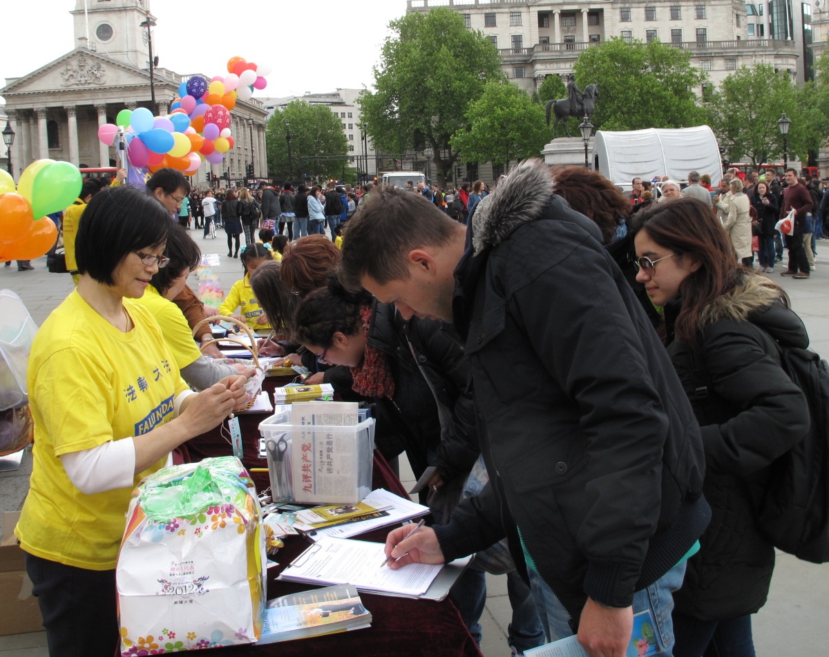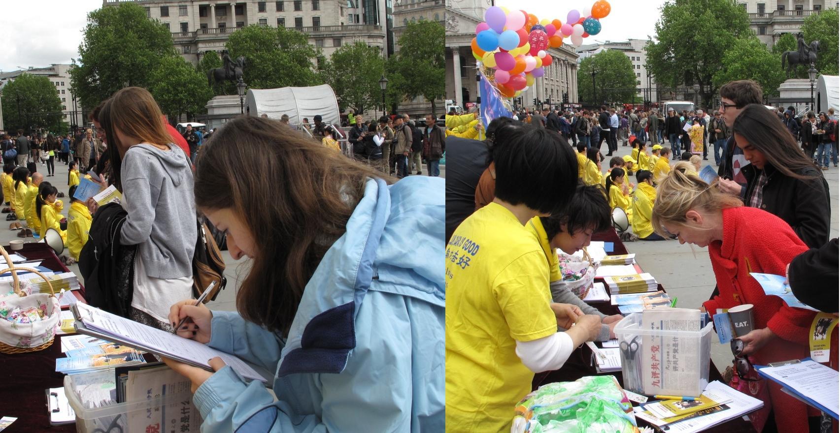 家住伦敦的阿莱克森(Alexon)女士周六下午恰巧途径鸽子广场,第一次看到法轮功的她立即被世界法轮大法日的庆典活动所吸引。停留良久,她长时间注视着展示功法的法轮功学员,似乎不愿挪开目光,她还在反对中共活摘法轮功学员器官的征签表上签了字。