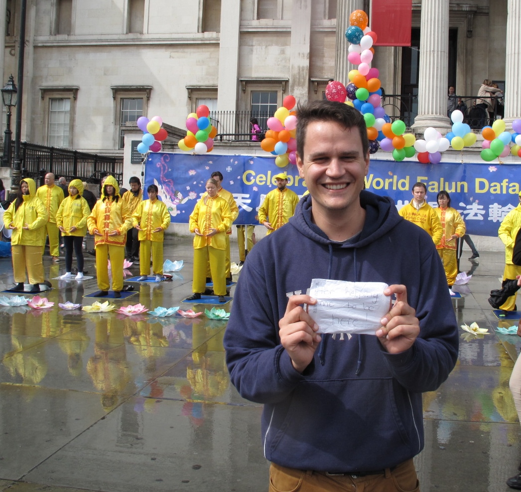 亚历山大(Alexander)是位西班牙青年,来伦敦进行工作面试,在离开伦敦几小时之前到鸽子广场游览,惊喜地看到庆祝世界法轮大法日的场面,法轮功学员坚持在雨中宁静祥和地展示功法的场景让他感动,他举着写有“帮我到这里来(For helping me to be here)”的一张纸站在法轮功学员的炼功队伍前面让同来的女友为他留影。他介绍说,自己以前也练过打坐,但没有坚持下来,与眼前的法轮功学员没法比。他说:“太祥和了,在雨中仍能这样专注,真了不起。”他还表示非常高兴自己能有机会看到法轮功、感受到一份难得的宁静、祥和和美好,为此他心怀感激。