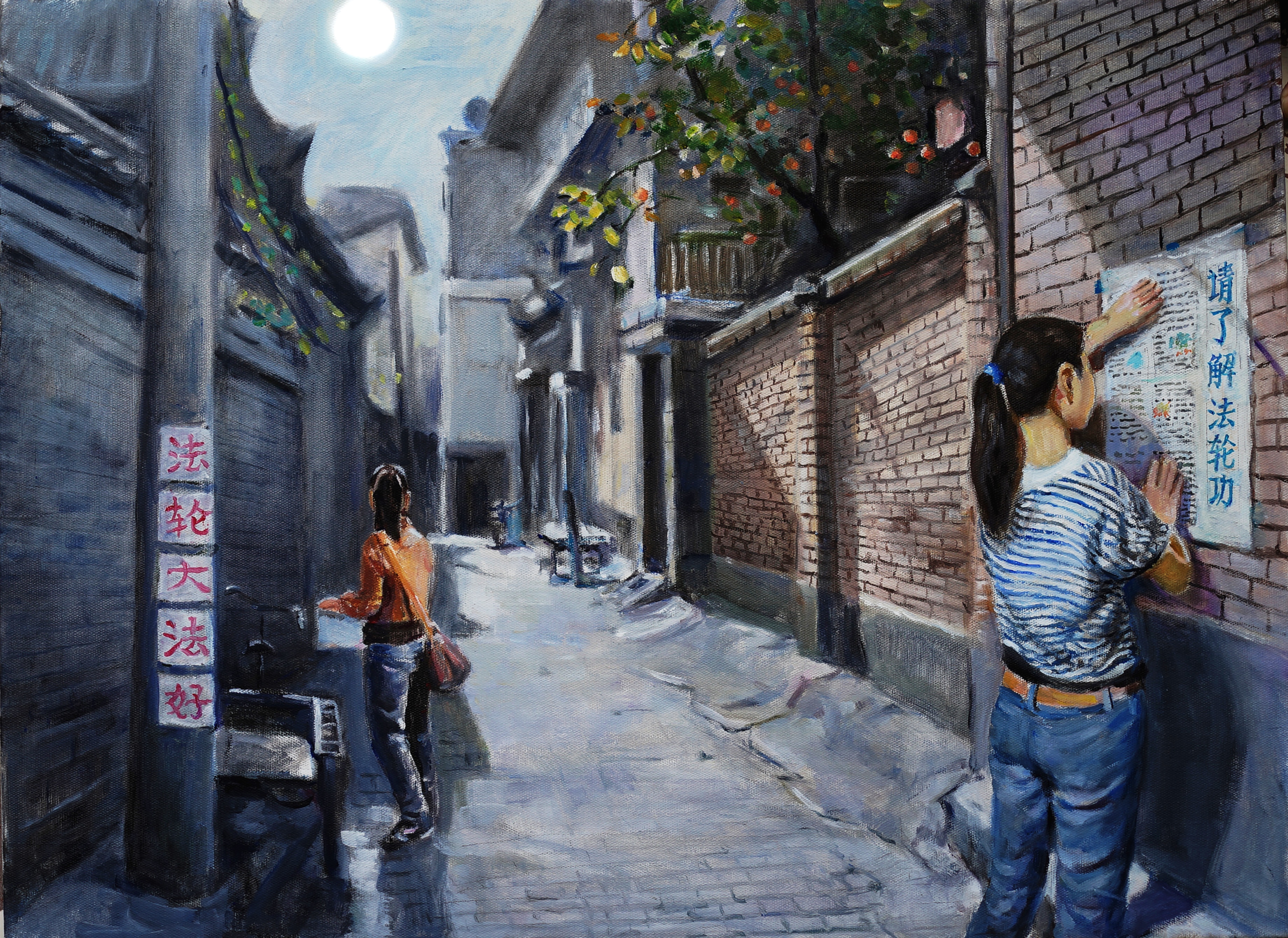 注:大陆许多大法弟子白天上班,很忙。利用晚上时间外出理智镇静地粘不干胶真相标语救人。