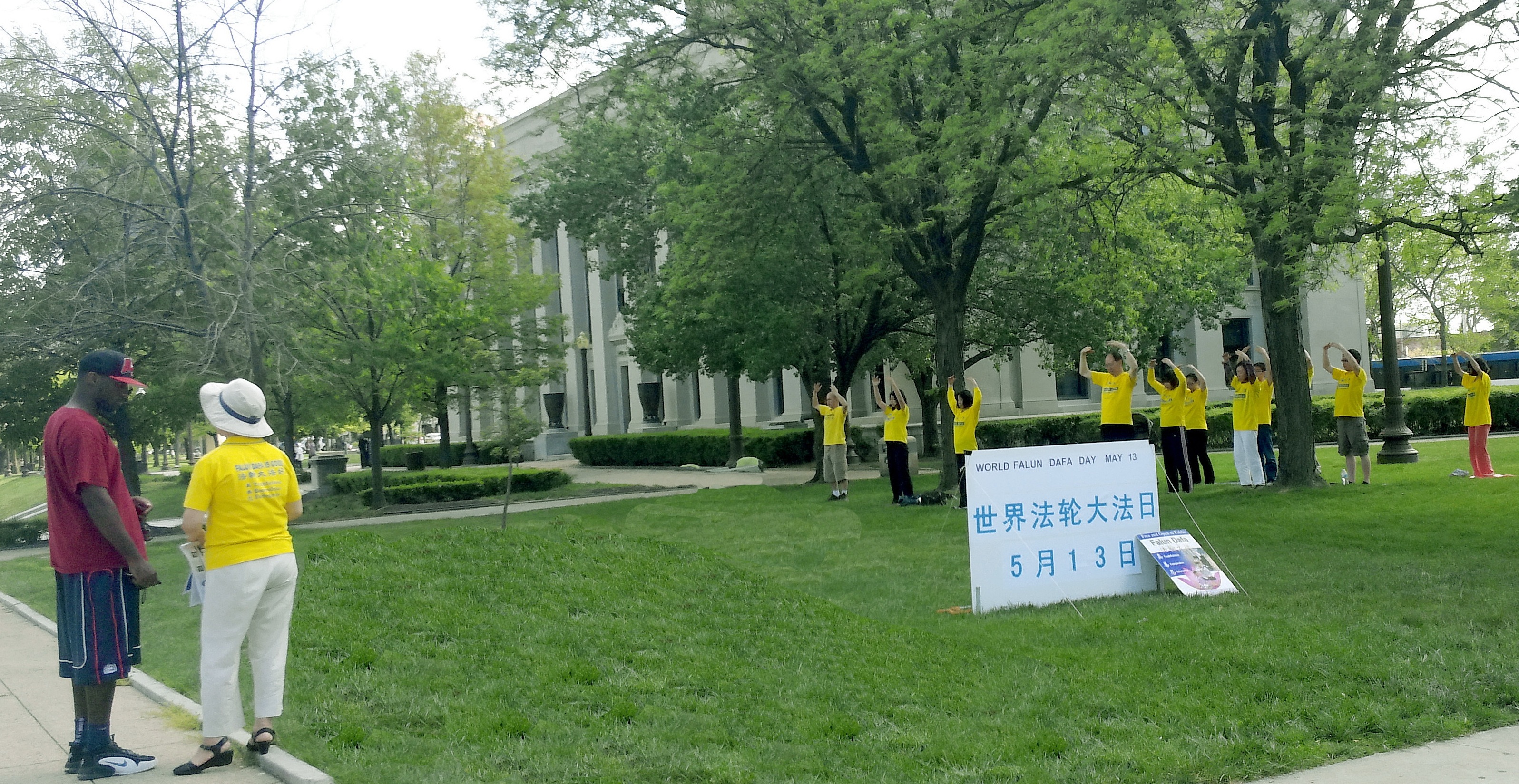 五月十日上午,法轮功学员们来到白河州立公园集体炼功。下午,学员们又来到中央图书馆前弘法。学员们展示的优美而舒缓的炼功动作,吸引了很多的过往路人。有的路人向学员们挥手致意,有的伸出大拇指频频点头微笑,有很多人主动询问和索要法轮功真相资料,还有的来到学员身边学起炼功动作来。