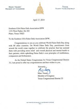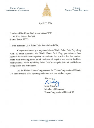 美国德州国会议员马克•维西(Marc Veasey)二零一四年四月十七日向法轮大法学会发来贺信,祝贺法轮大法日。