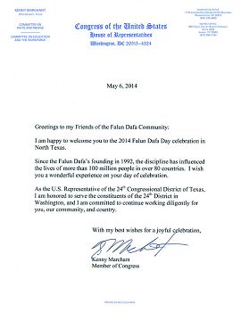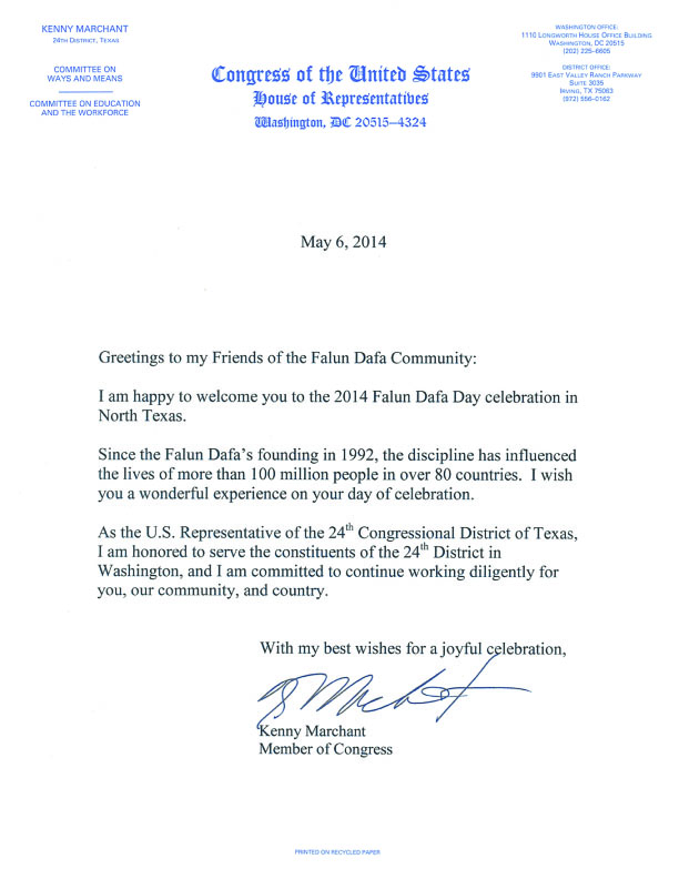 美国德州国会议员肯尼•莫昌特(Kenny Marchant)二零一四年五月六日向法轮大法学会发来贺信,祝贺法轮大法日。