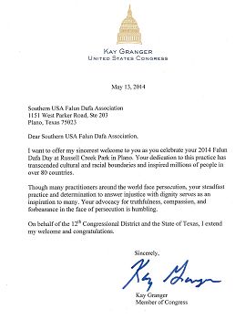 美国德州国会议员奇•格兰杰(Kay Granger)二零一四年五月十三日向法轮大法学会发来贺信,祝贺法轮大法日。