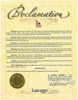 美国德州兰卡斯特(Lancaster)市市长马可斯•奈特(Marcus E. Knight)宣布二零一四年五月十一日至十七日为法轮大法周。