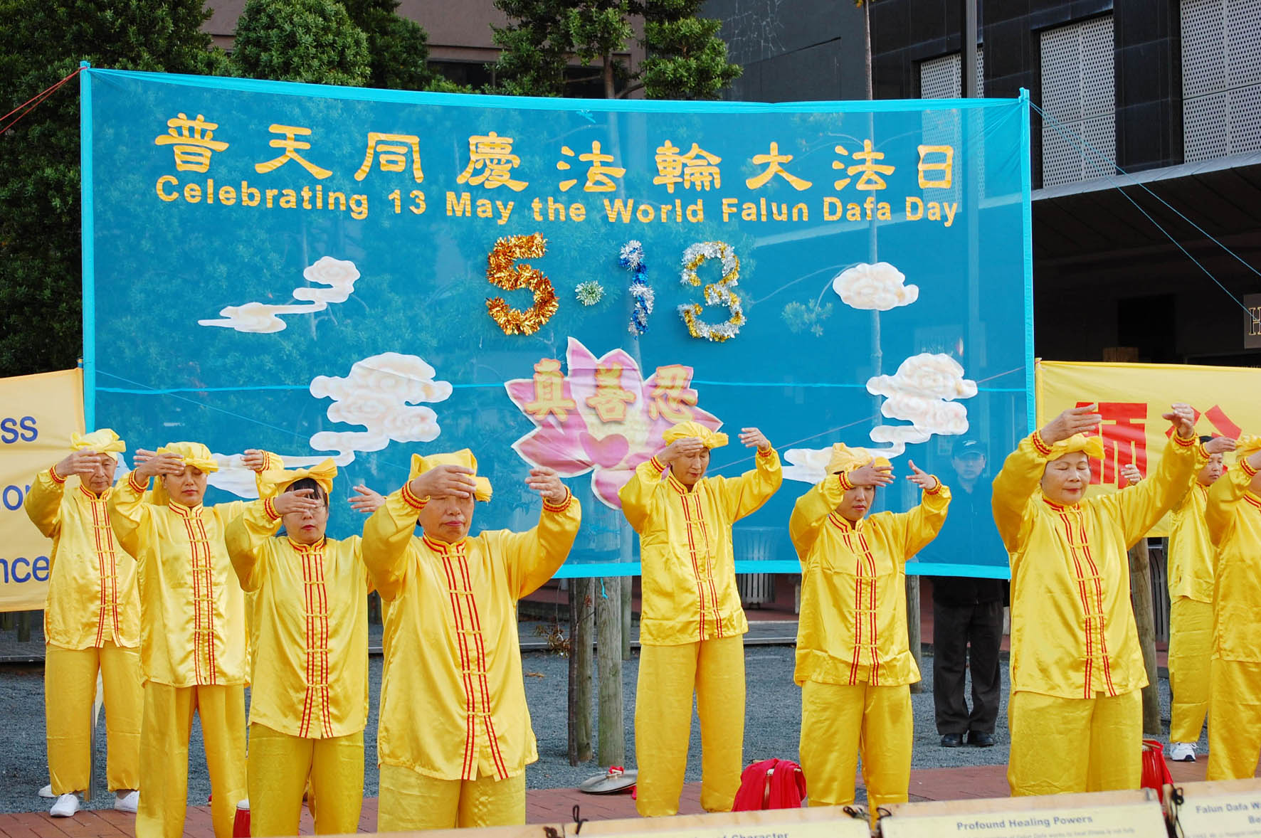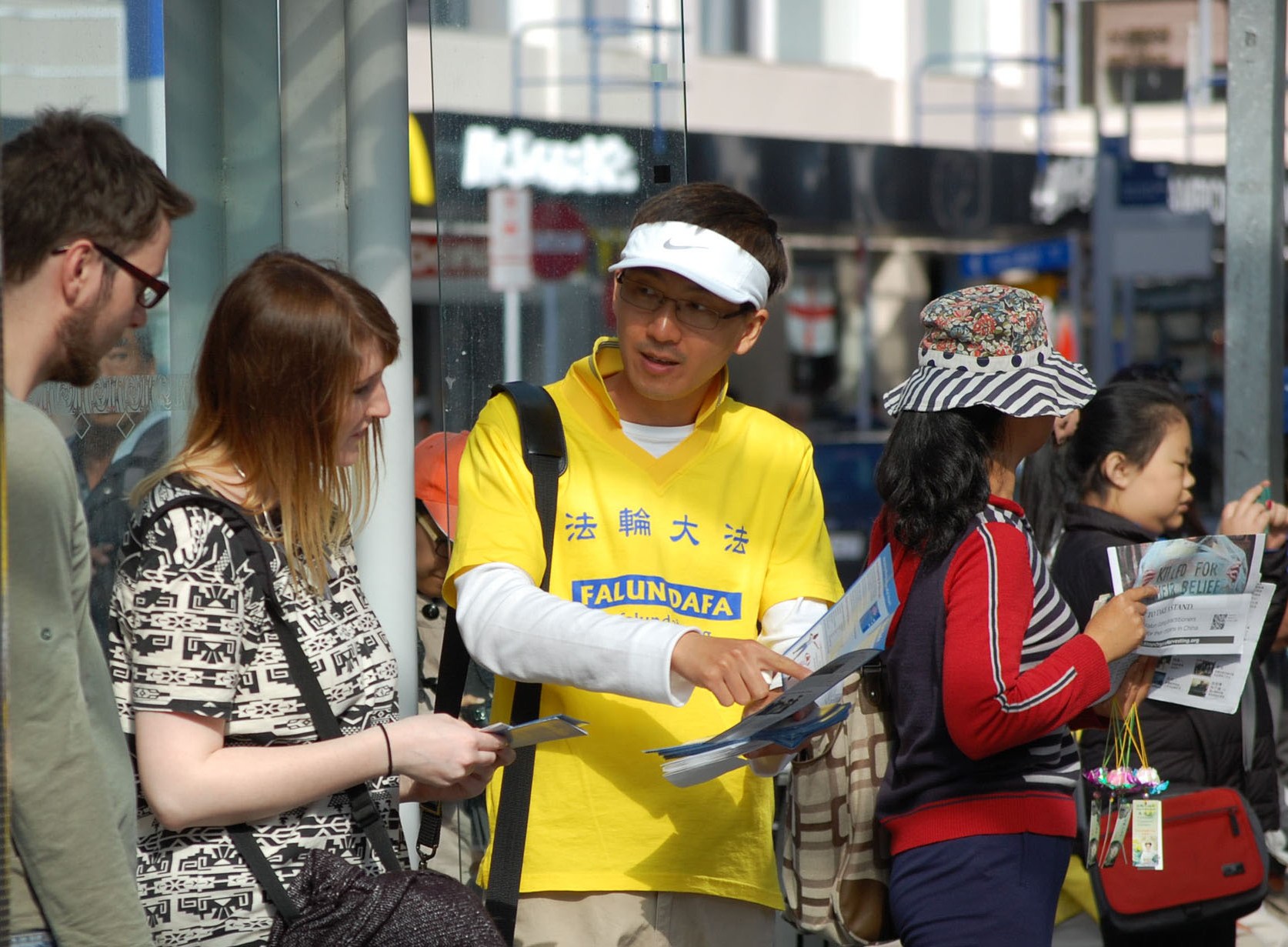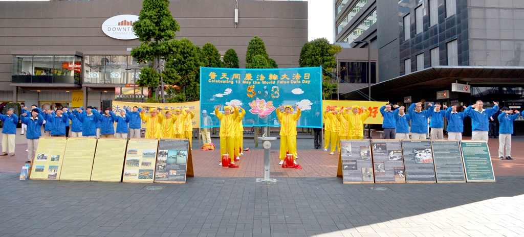 南半球的五月已近冬日,但新西兰庆祝法轮大法日活动现场一片温暖祥和,悠扬的法轮功炼功音乐声响起,感染了现场的每一个角落,音乐声中法轮功学员向路人演示了五套功法。众多路人被这优美的音乐与祥和的炼功场面所吸引,纷纷驻足观看,同时也认真阅读法轮功真相展板和传单,有人啧啧称赞道:“如此平和,太美了。”