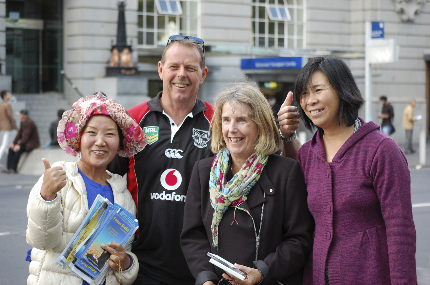 庆祝活动现场,有观众找到学员要求学功。来自内皮尔(Napier)的乔治•汉德森先生和太太朱莉在观看了功法演示之后,立即请在场的学员教授他们功法。认真地学习了功法后,他们表示,回去后一定每天都炼功。夫妇俩都十分认同法轮大法的“真、善、忍”原则,表示这也是他们在日常生活中一直希望坚持的原则。朱莉谈到,整个炼功场面十分平和。她说:“感觉太好了。我刚才学功时感到特别放松。”乔治也表示对法轮功很感兴趣,学功时感觉很好,很放松。汉德森夫妇最后还和学员合影,汉德森先生竖起大拇指:“法轮大法好!”