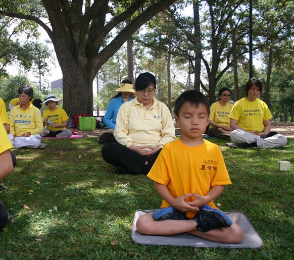恰逢美国的母亲节的周末,天气晴朗温和,很多家人外出游玩的人数大增,荷门公园成了家人休闲的景点之一,附近的停车场爆满,游人乘坐环游公园小火车的人数也比往日增多。中心地段的法轮功学员正在炼功,前区横幅:“法轮大法、真善忍”“世界法轮大法日”。法轮功学员的炼功成了当日公园的特别风景线。