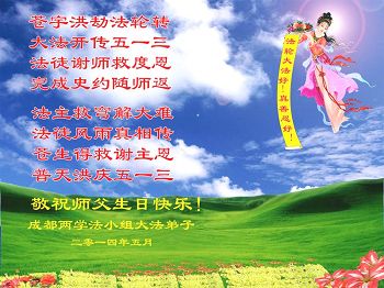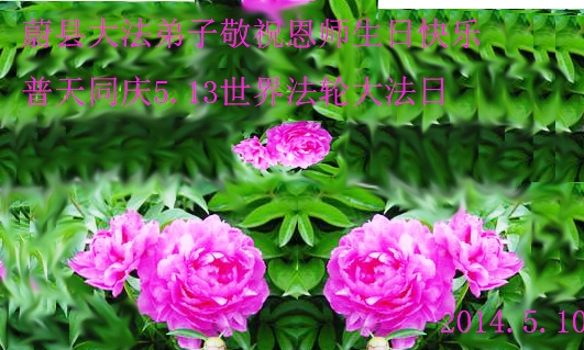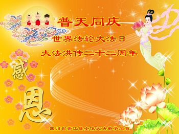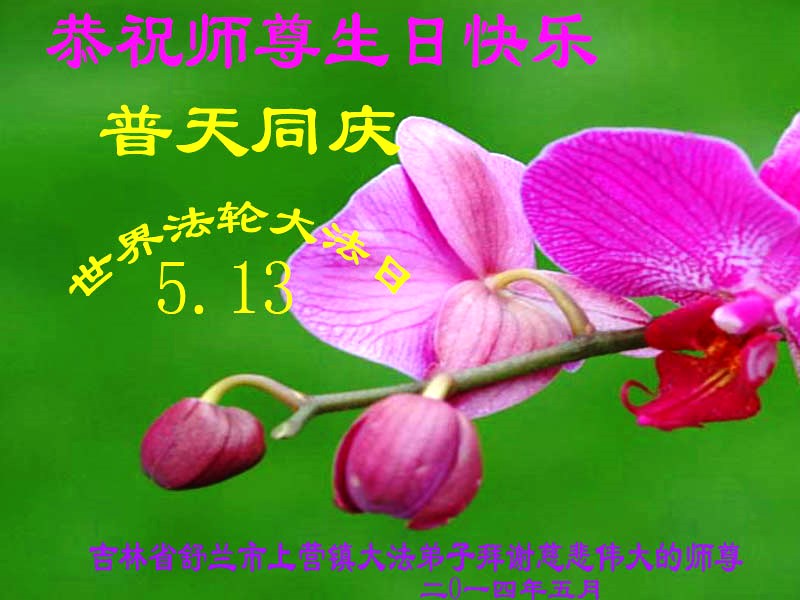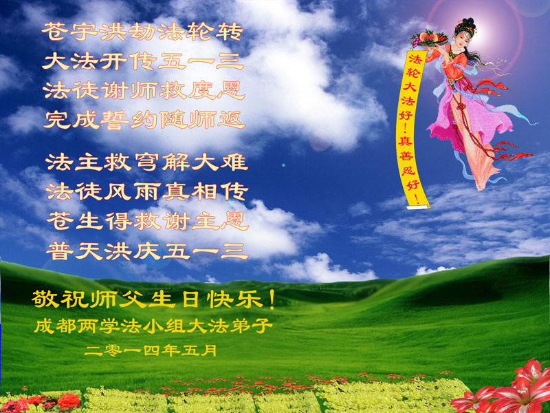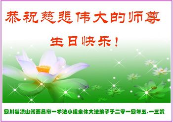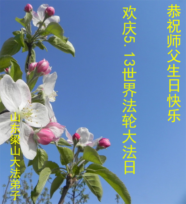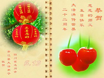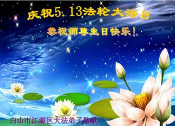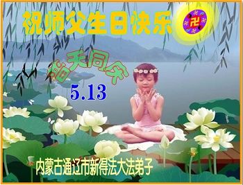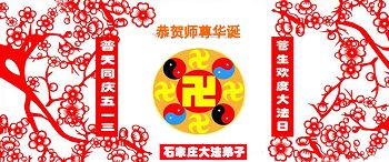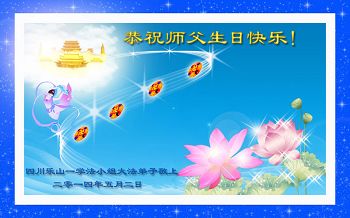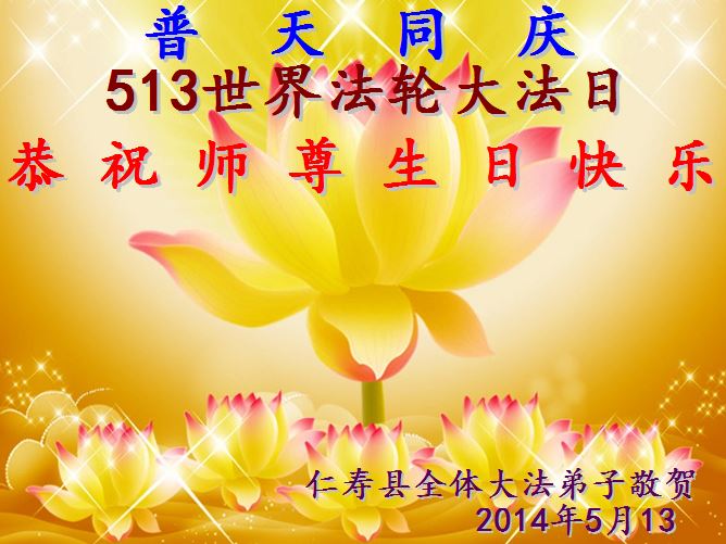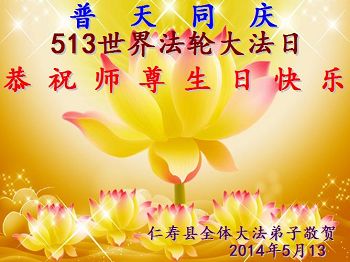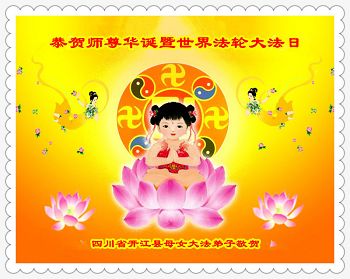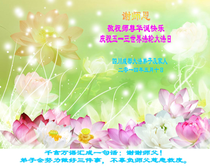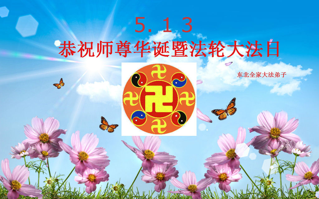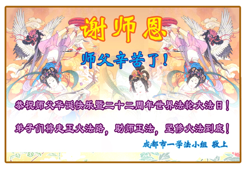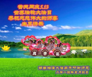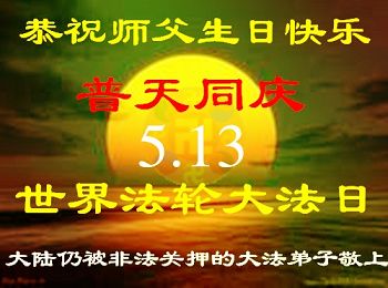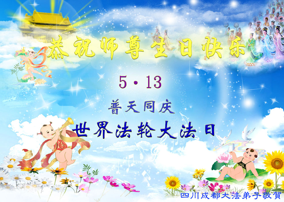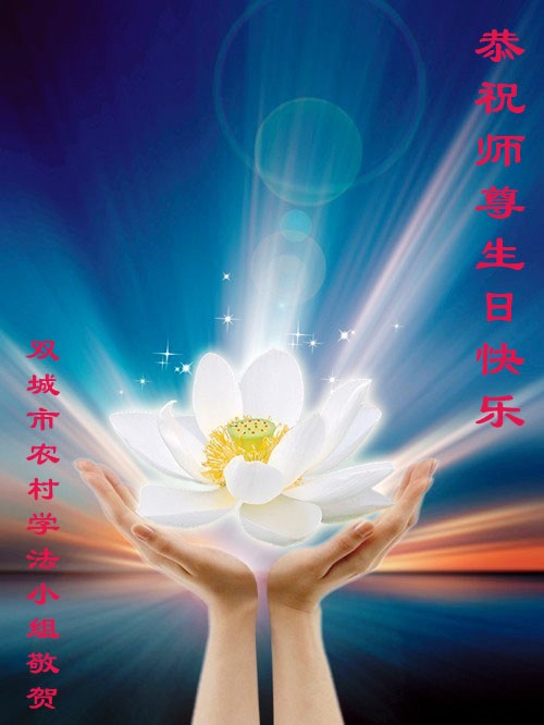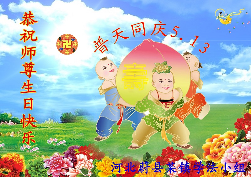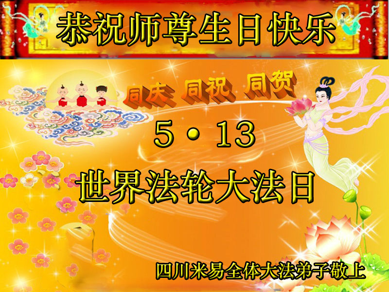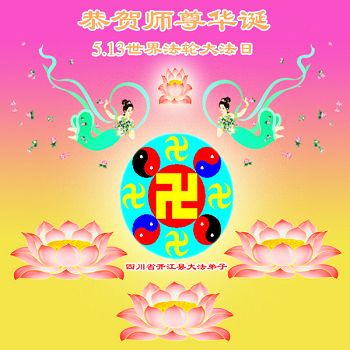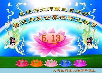 一年过去了,又迎来了新的一年,天上地上普天同庆“五一三”全世界法轮大法日的今天,我们眉山市、县、镇、乡、村全体大法弟子,向慈悲伟大的师父问候,师父您好,师父生日快乐!法轮大法好!真、善、忍好!