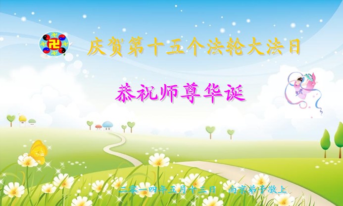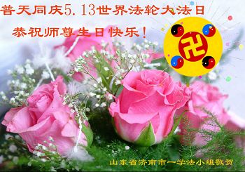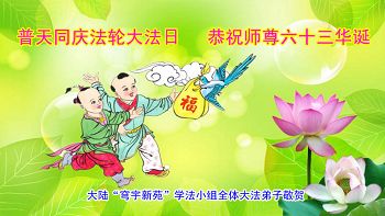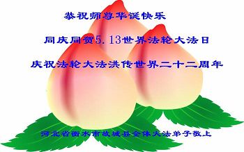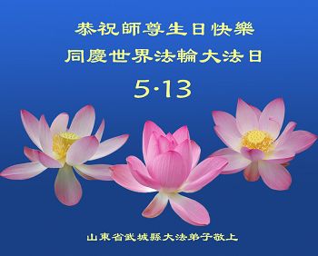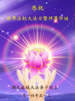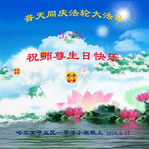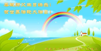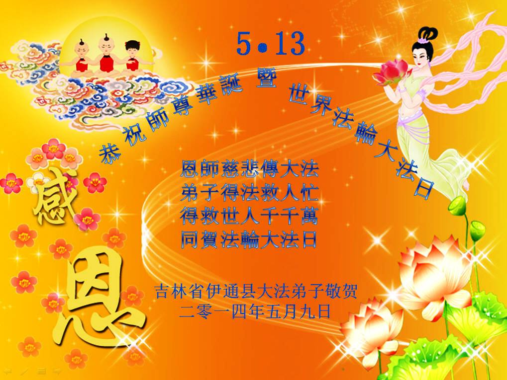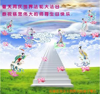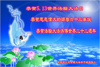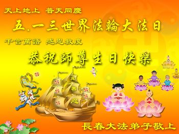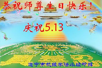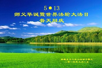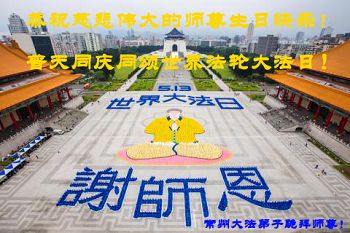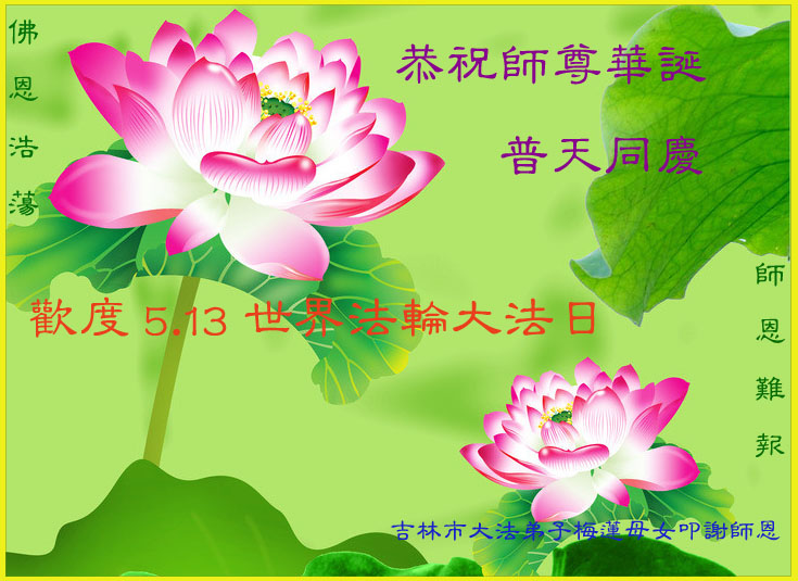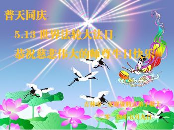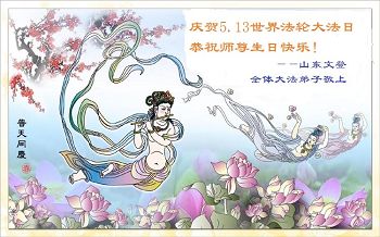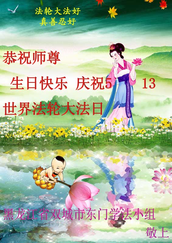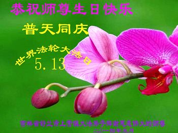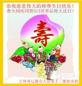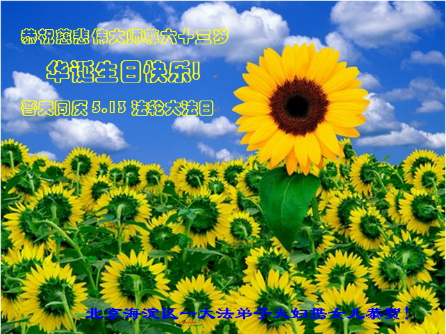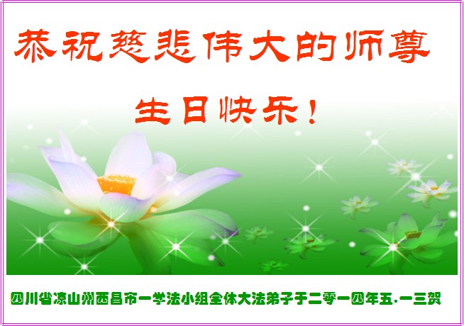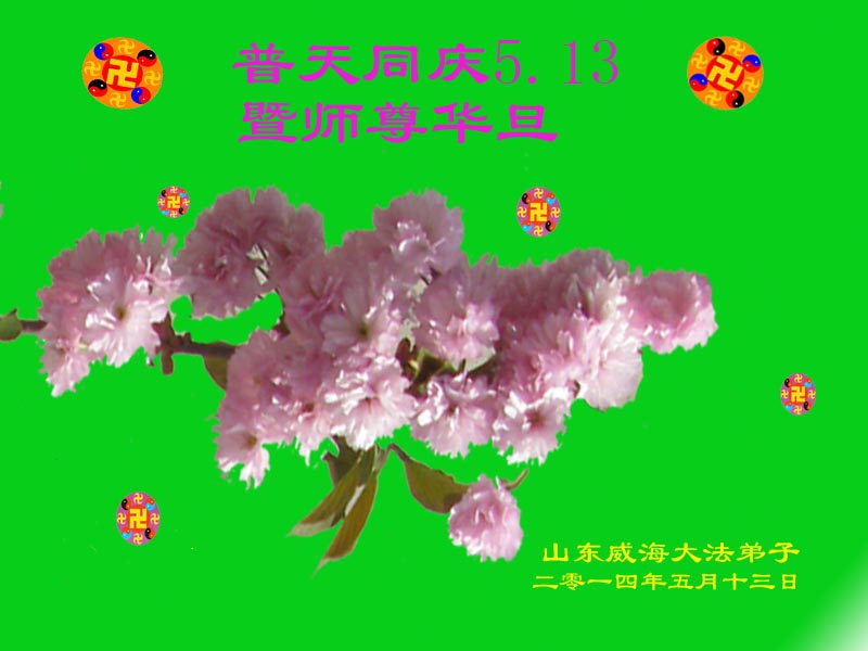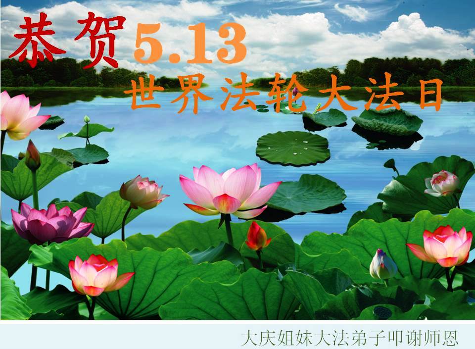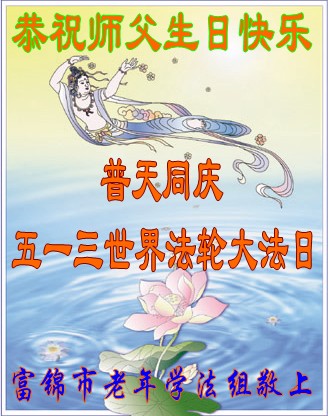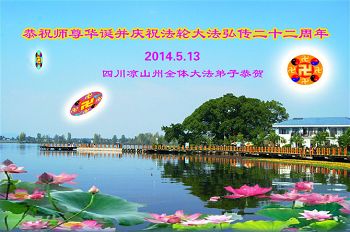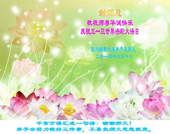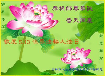 一年过去了,又迎来了新的一年,天上地上普天同庆“五一三”全世界法轮大法日的今天,我们眉山市、县、镇、乡、村全体大法弟子,向慈悲伟大的师父问候,师父您好,师父生日快乐!法轮大法好!真、善、忍好!