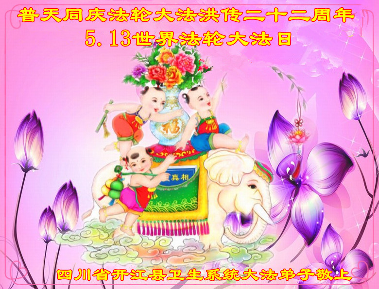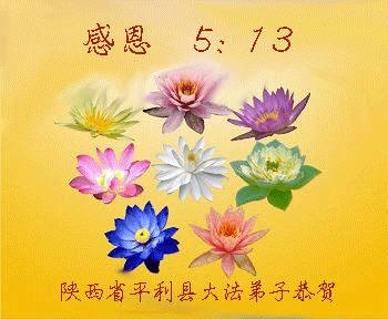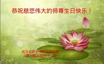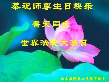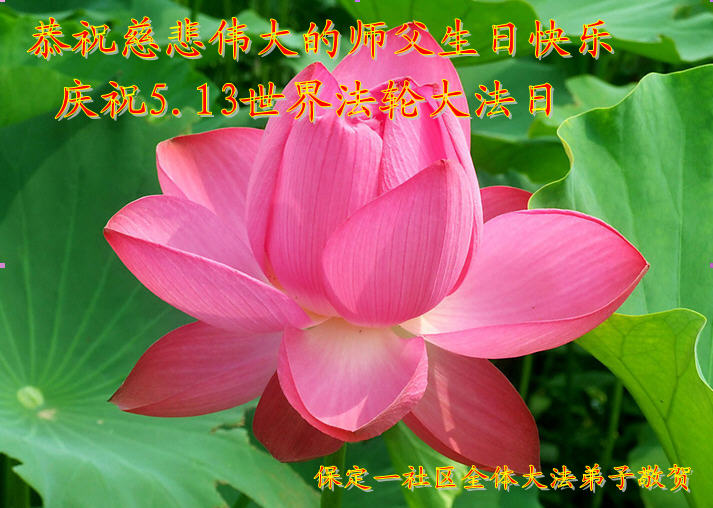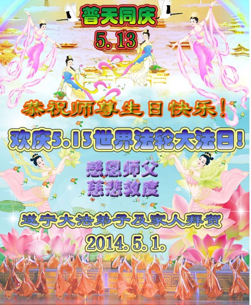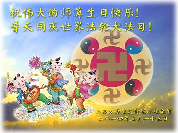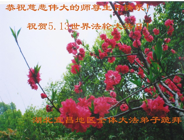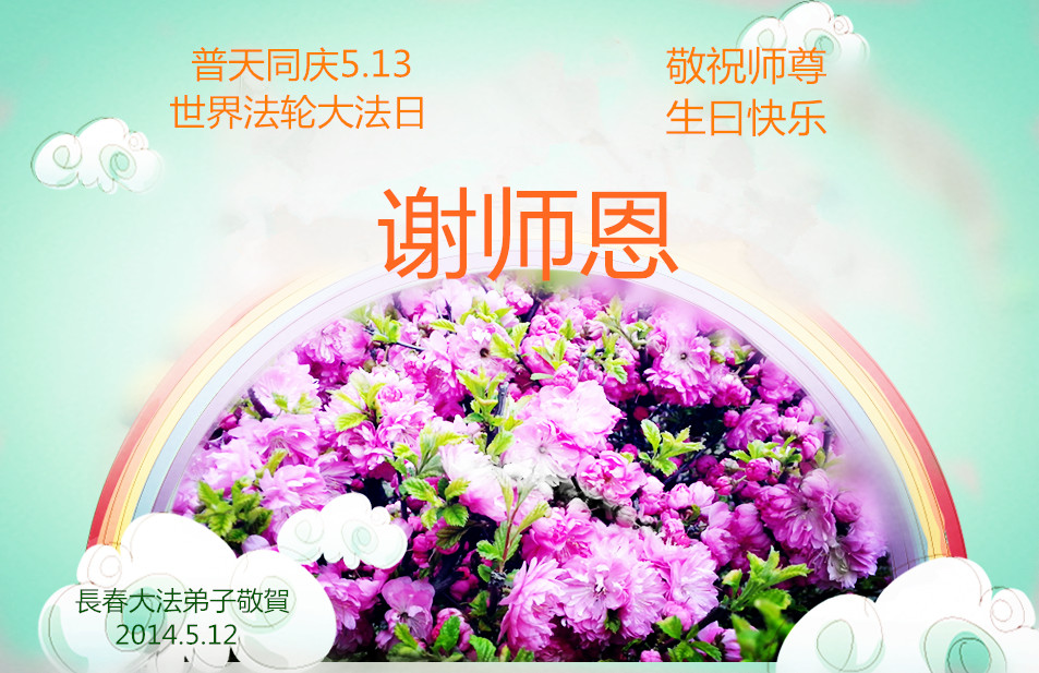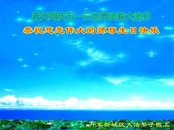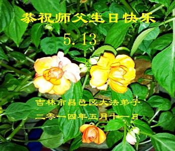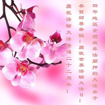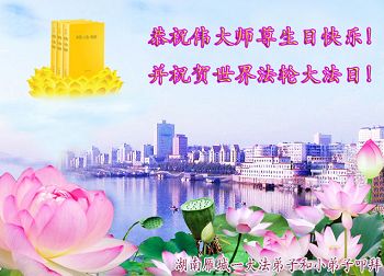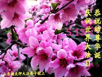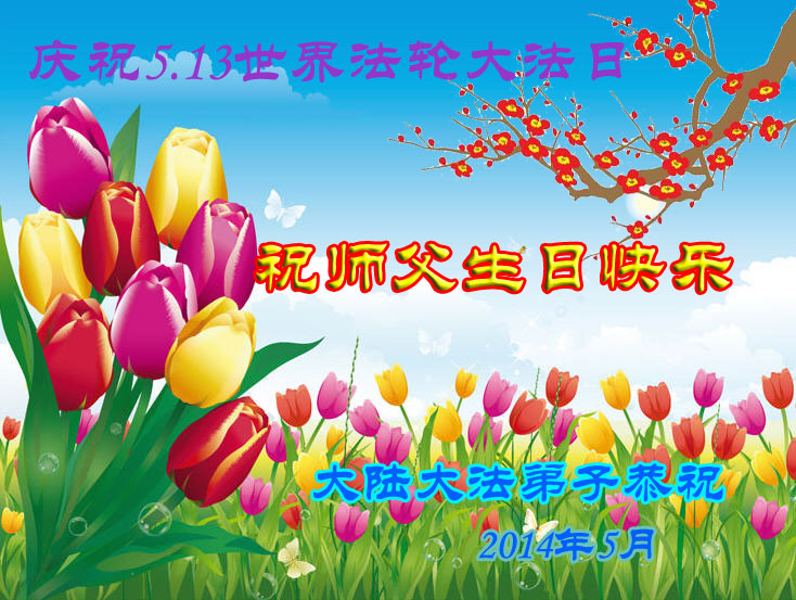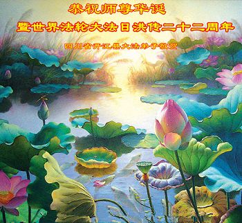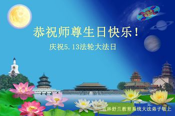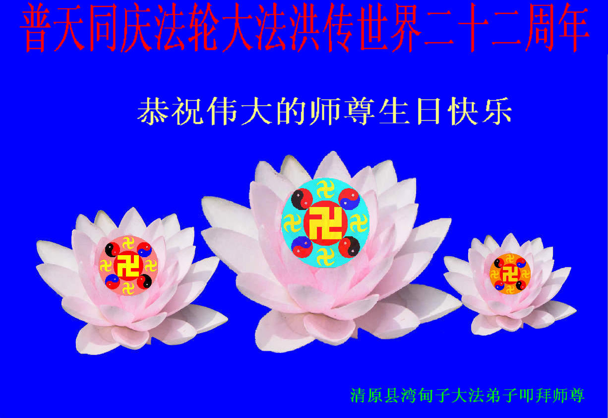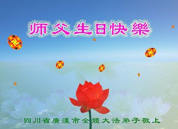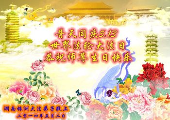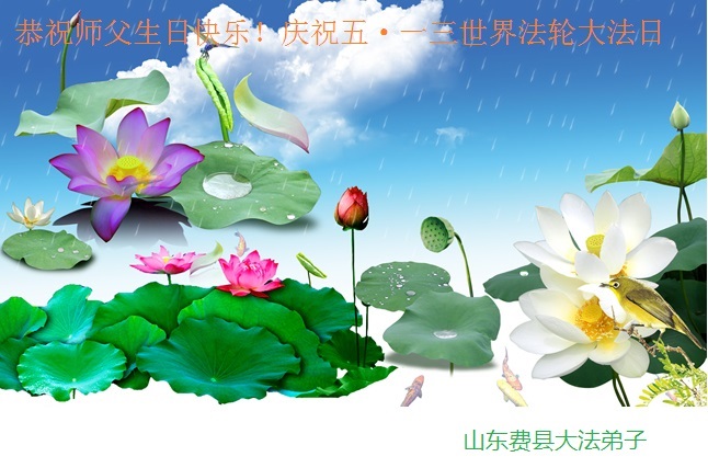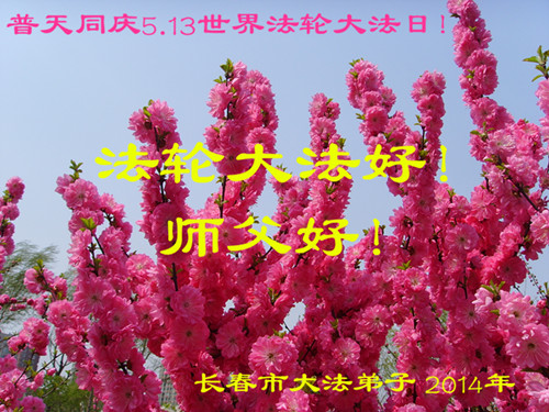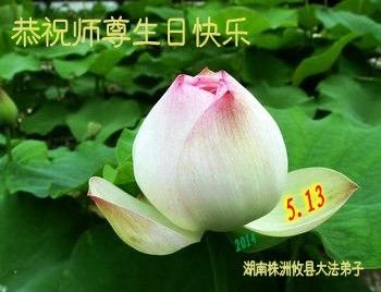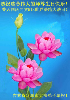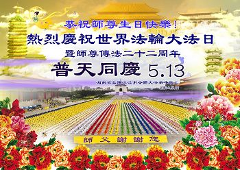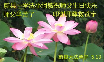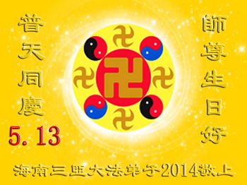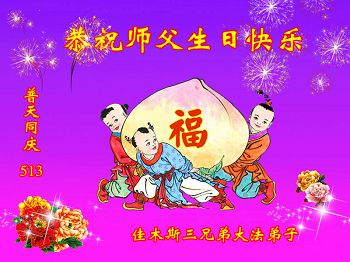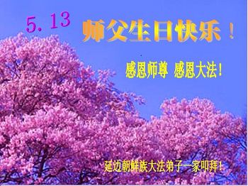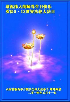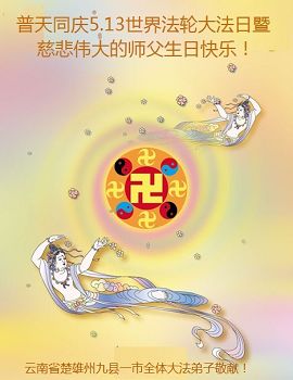 一年过去了,又迎来了新的一年,天上地上普天同庆“五一三”全世界法轮大法日的今天,我们眉山市、县、镇、乡、村全体大法弟子,向慈悲伟大的师父问候,师父您好,师父生日快乐!法轮大法好!真、善、忍好!
