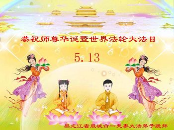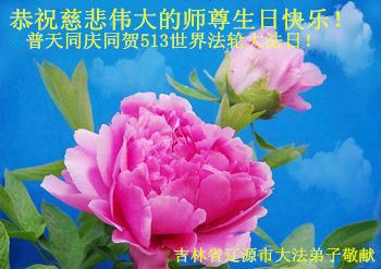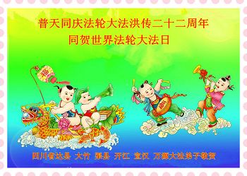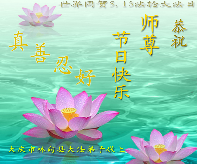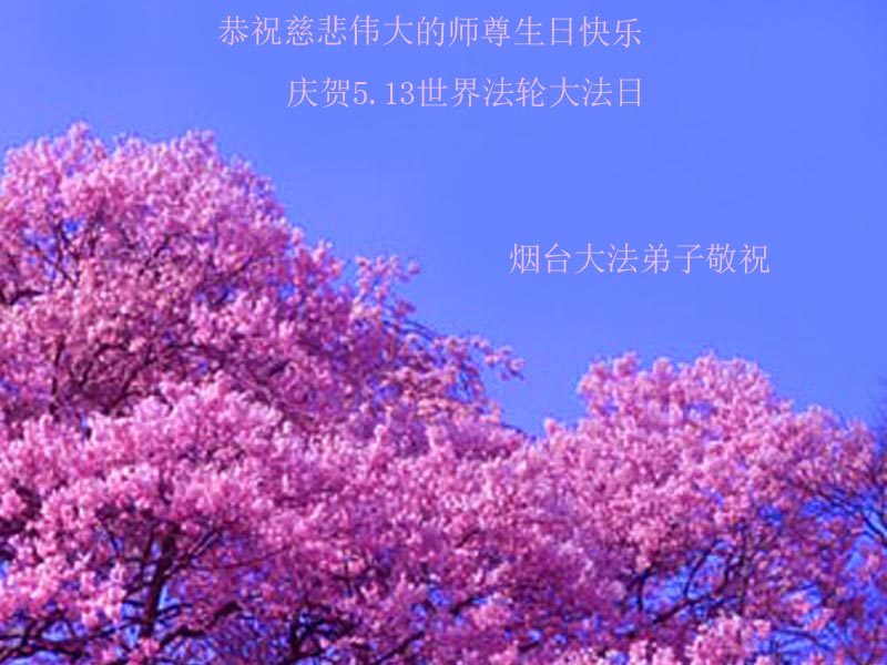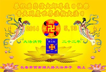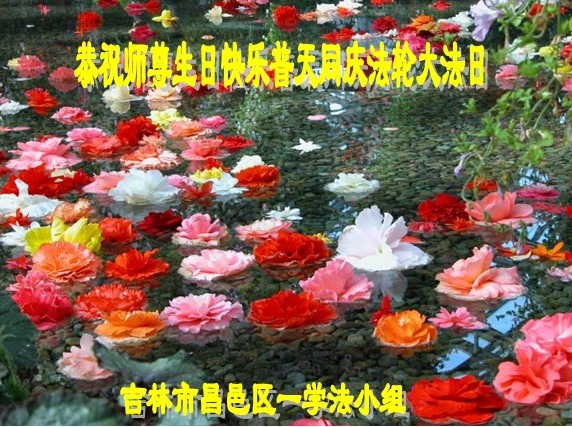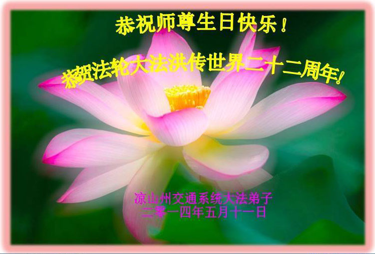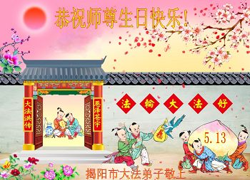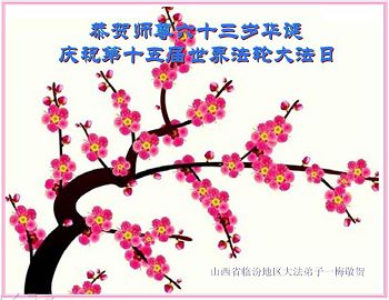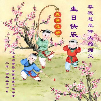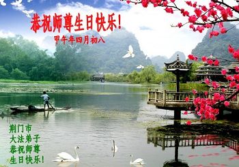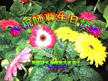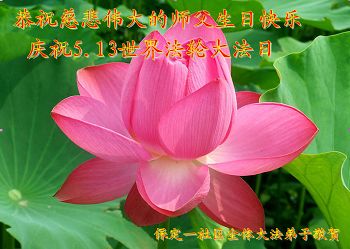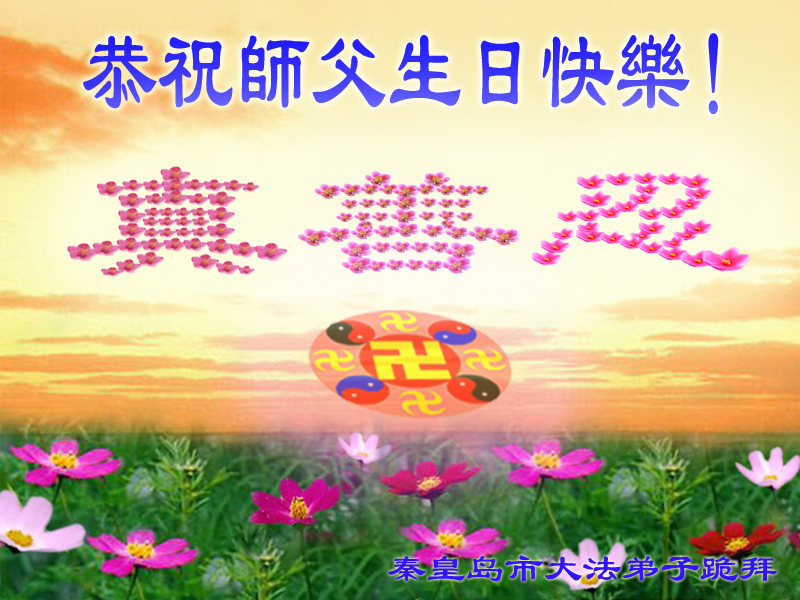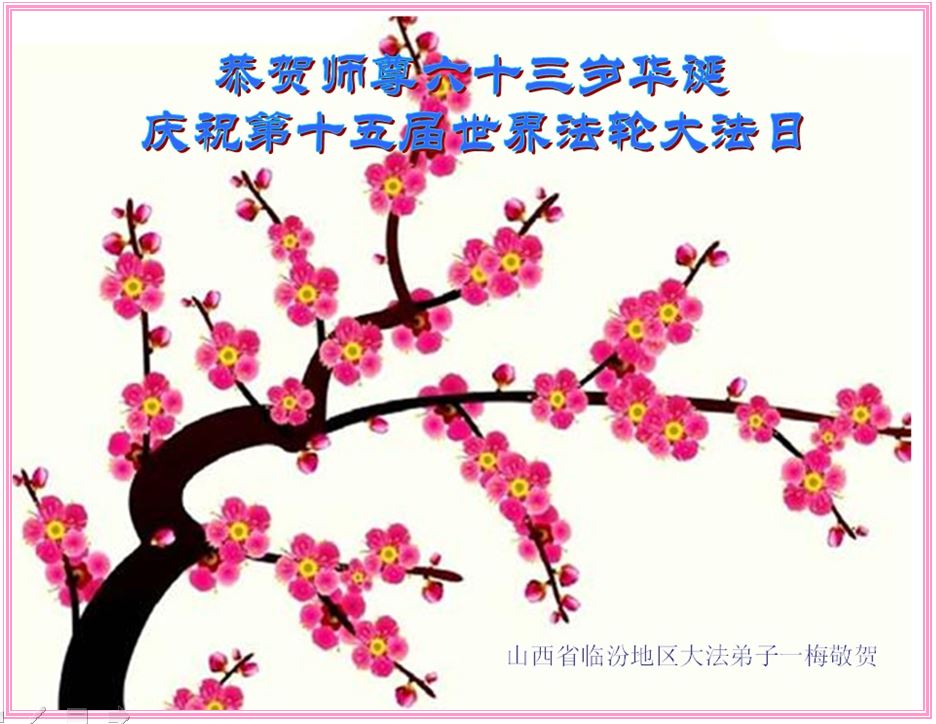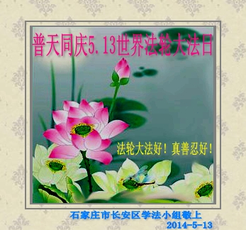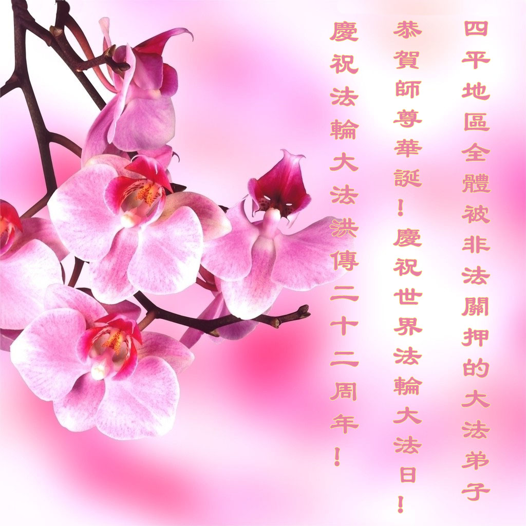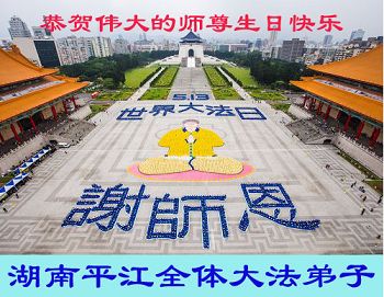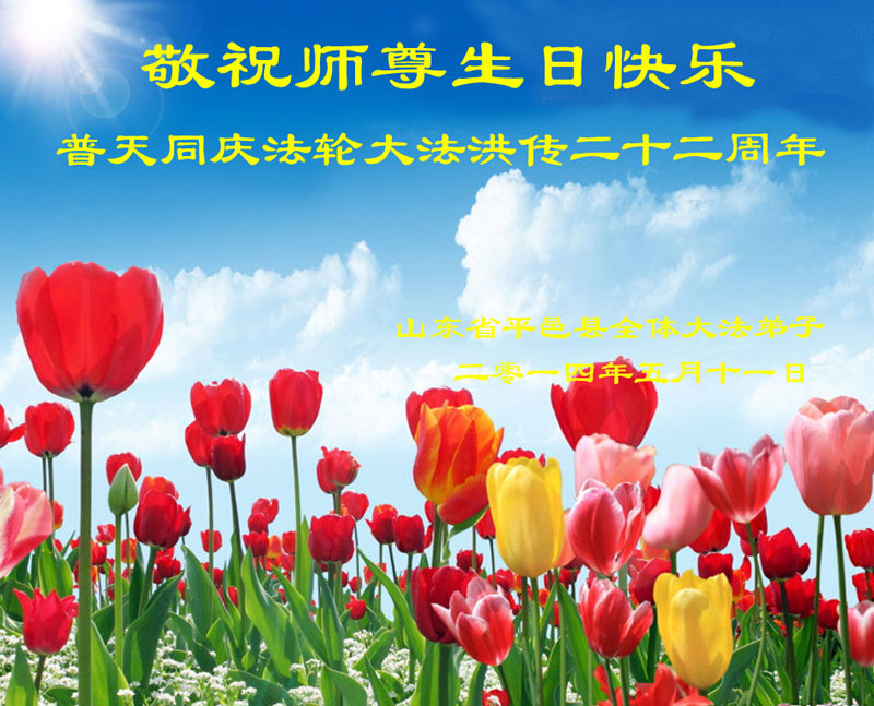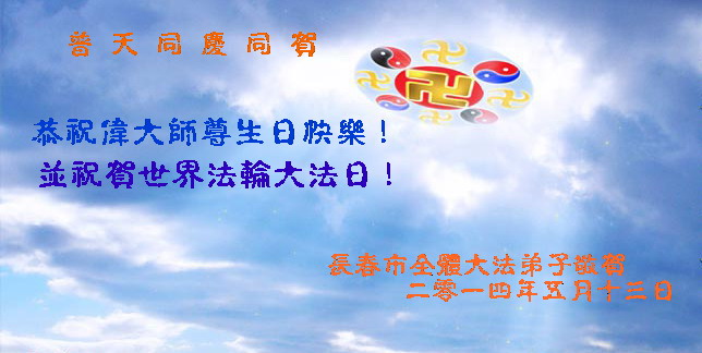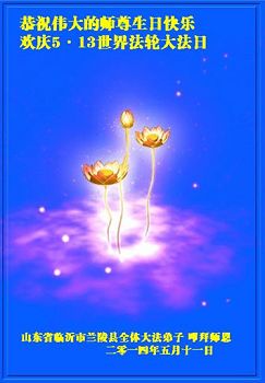 一年过去了,又迎来了新的一年,天上地上普天同庆“五一三”全世界法轮大法日的今天,我们眉山市、县、镇、乡、村全体大法弟子,向慈悲伟大的师父问候,师父您好,师父生日快乐!法轮大法好!真、善、忍好!